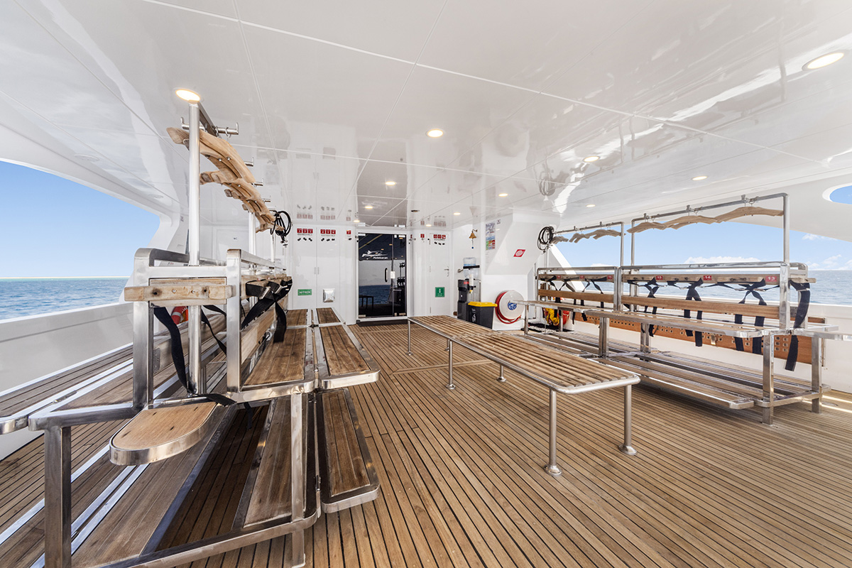 Ponte prncipale piattaforma diving con postazioni personali. Banco ricarica attrezzature fotovideo