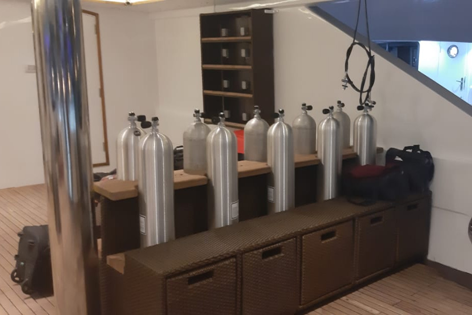 Main Deck area diving con postazioni bombole e attrezzatura personale. Banco attrezzature fotovideo, postazioni con prese elettriche per ricariche