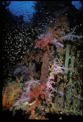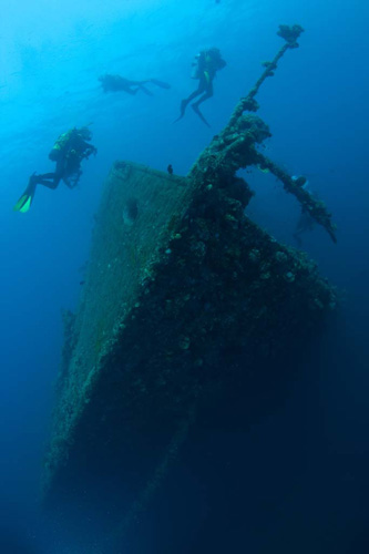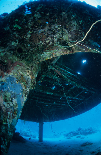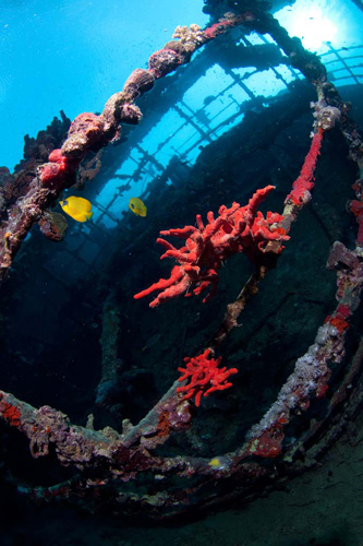 Prima di rientrare in porto, effettuiamo l’ultima immersione di questa prima settimana sul relitto dell’Umbria. La nave riposa a Wingate Reef nelle vicinanze di Port Sudan, affondata dal suo equipaggio italiano nel giugno del 1940 per non farla cadere in mano inglese. Lo scafo è praticamente integro, abbiamo visitato le diverse stive, contenenti Fiat 1100, sacchi di cemento, bottiglie, bombe di aereo, munizioni, scialuppe; il tutto ormai colonizzato da coralli tra i quali nuotano pesci di ogni forma e colore. Sapere poi che nell’affondamento non ci siano state vittime, anche il gatto del capitano si è salvato, mi permette di godere maggiormente di questa visita.