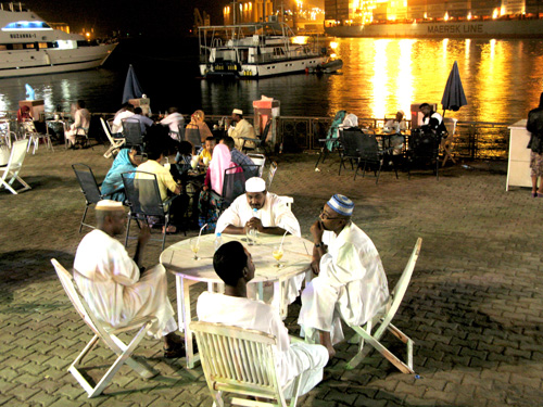 Sha’ab Ambar, sarà l’immersione pomeridiana per tutti i giorni successivi. Sempre ricca di carangidi, un banco enorme di chirurgo, grigi, martello, pinna bianca, tartarughe. Poi a Peshwa, dove oltre ai “soliti grigi” abbiamo la compagnia di un grosso barracuda, che, per sua sfortuna ci segue fino alla barca. Logan e Nakhalat detta “Pinnacolo”, dove per la prima volta vedo una coppia di piccoli gobidi leopardo bellissimi. Riprendendo la via del nord ci fermiamo nuovamente a Jumna per la penultima immersione, che non poteva darci soddisfazione maggiore: riusciamo infatti a vedere non uno solo, ma ben due branchi di squali martello. Se chiudo gli occhi è un immagine che vedo ancora oggi, stupefacente: nel blu iniziano ad apparire tantissime sagome bianche, piano piano, girando si avvicinano e diventano sempre più nitide fino ad avvicinarsi, riesco a vedere chiaramente gli occhi, il “martello”, ad apprezzare la sinuosità con cui si muovono… non penso che li dimenticherò e non avrei mai creduto di arrivare a non temerli più. Facciamo correre il Suzanna fino a Sanganeb per fare l’ultima immersione e poi purtroppo si ritorna verso Port Sudan. Siamo alla fine della settimana e questa volta tocca anche a noi fare i bagagli! Arrivati in porto ancoriamo e dopo il tramonto il lungomare si accende di luci e si popola di donne, bambini e uomini che passeggiano e si fermano a guardare il rientro di tutte le barche da crociera. Il loro spettacolo del venerdì sera. Dopo cena scendiamo a terra e andiamo a bere un caffé e fumare una shisha. Samy ci racconta della povertà di questa gente, delle giovani ragazze che servono il caffé, che arrivano clandestine dall’Eritrea e vivono in dieci in una unica stanza, dei ragazzini che vendono di tutto, dalle schede telefoniche alle conchiglie, dai semi di zucca ai parei.