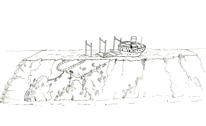 Scendendo in acqua e seguendo la fiancata di sinistra, si raggiunge la prua che appoggia su un fondale a -25 metri. Adagiate su due scogli madreporici, si notano le enormi ancore calate in acqua nella speranza di bloccare la nave sul reef. L’ancora di sinistra appoggia in verticale alla base di uno scoglio madreporico con la catena posizionata in diagonale mentre quella di destra, poco oltre, è incagliata nel reef con la catena fluttuante. Tra le due catene si nota l’imponente prua a -25 metri di profondità, deformata dal forte impatto contro la barriera. Seguendo la fiancata di sinistra, noteremo un primo avvallamento del reef, attraversandolo si può accedere al versante opposto. Sulla chiglia sono presenti piccole gorgonie attaccate alle lamiere. La fiancata di destra, più esposta alle correnti è ricoperta di formazioni madreporiche, risalendo verso poppa si incontra un secondo avvallamento con fondale di sabbia chiara che può essere a sua volta attraversato. Proseguendo oltre si raggiungere l’enorme timone all’interno del quale si trova l’enorme elica a 4 pale ancora in perfette condizioni. Tutt’intorno al relitto sono presenti parti delle strutture della nave collassate al momento dell’impatto tra cui il reggi bussola e il telegrafo di macchina. Nonostante il poco interesse generale, si tratta di una immersione comunque interessante dal punto di vista scenografico per la posizione del relitto, in particolare della zona di prua che nelle giornate di mare calmo potrà essere osservata in tutta la sua totalità.