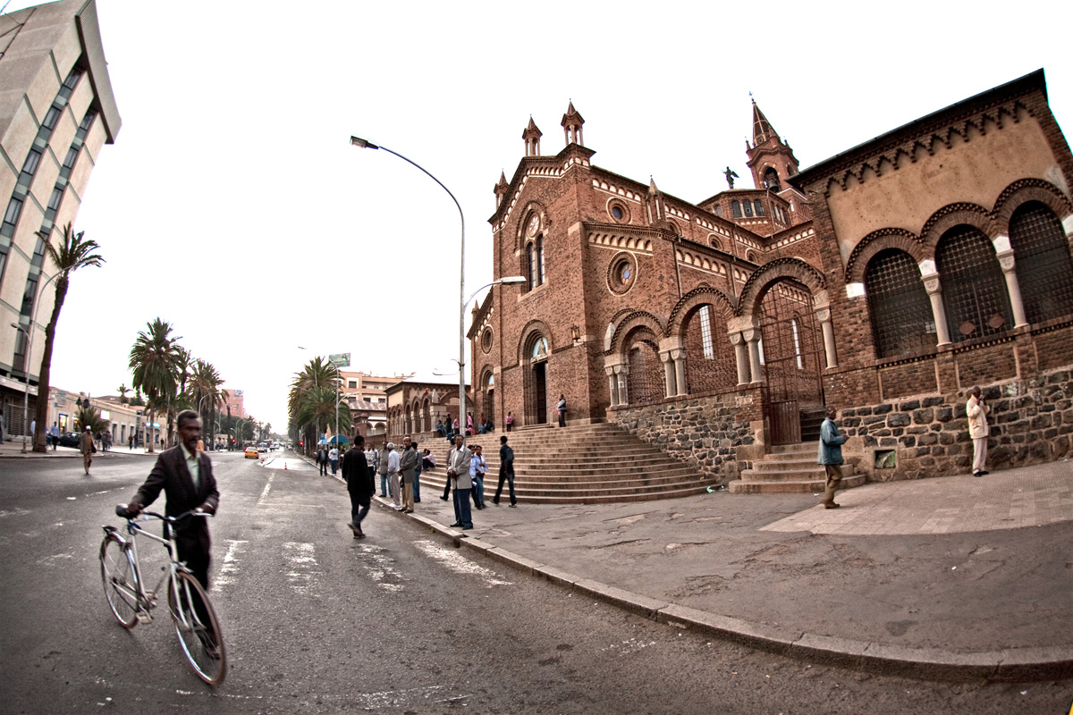Il ritrovo domenicale per buona parte degli asmarini è presso la famosa cattedrale, simbolo della città dove al mattino si celebra la messa anche in italiano. Terminata la messa la gente scende in strada per la classica passeggiata, una degna tradizione che è ormai scomparsa dalle abitudini di buona parte del mondo mediterraneo ma che è viva più che mai a questa latitudine. Le famiglie si radunano, gli amici si incontrano e le donne passeggiano sole e indisturbate lungo quello che un tempo si chiamava viale Mussolini e oggi è viale della Liberazione costeggiato da infinite file di palmizi. Anziani con inappuntabili cappelli a larghe tese e antiche ombre italiane che parlano ancora oggi correttamente la nostra lingua, intrattengono lunghe discussioni.