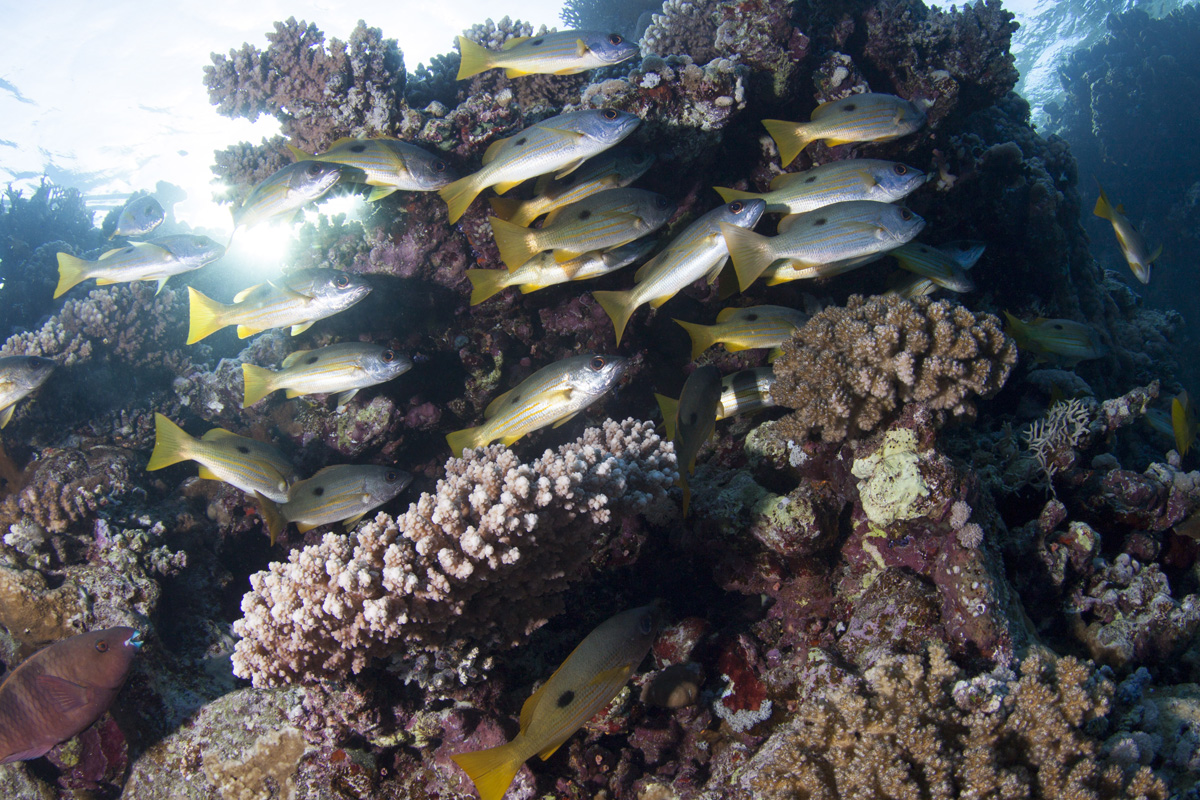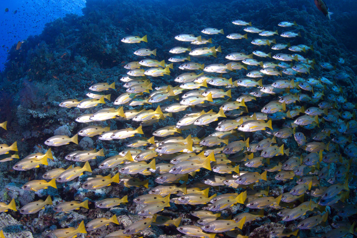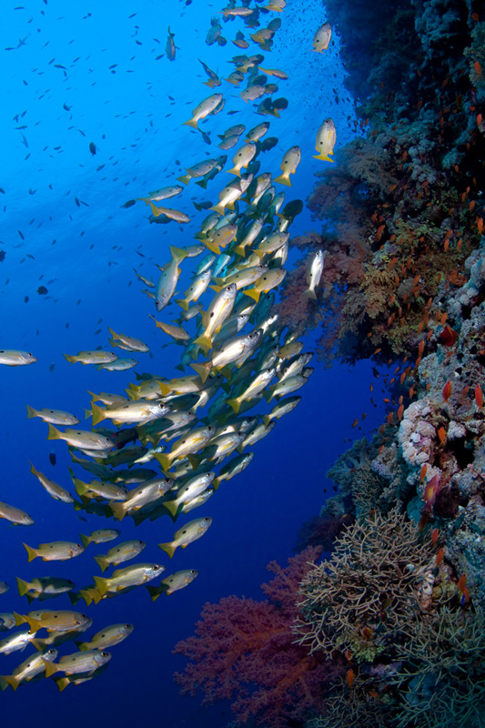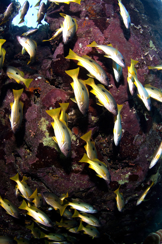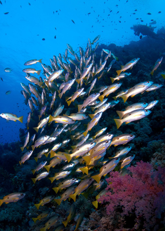 L'aggregazione compatta di un gruppo di pesci come nel caso degli azzannatori, ci permetterà di realizzare immagini particolarmente suggestive in quanto il soggetto principale del nostro scatto occuperà uno spazio importante all'interno dell'inquadratura. Sarà poi la vostra sensibilità di fotografi a decidere dove e come collocare il soggetto. Gli azzannatori sono perlopiù pesci timidi che dovranno essere avvicinati con molta attenzione per evitare di disturbarli e quindi farli fuggire. Una volta avvicinati al banco di pesci dovrete muovervi con estrema cautela evitando di pinneggiare nervosamente ma spostandovi con movimenti lenti che non disturbino gli animali. Per fare questo dovrete avere definito il vostro migliore assetto e concentrarvi esclusivamente sull'inquadratura. L'obiettivo più idoneo per riprendere il banco di Azzannatori sarà sicuramente il grandangolo. Come sempre è consigliato un primo scatto di prova per definire la migliore esposizione dopodichè dovrete concentrare tutta la vostra attenzione unicamente allo scatto finale. Fate molta attenzione all'orientamento del vostro flash in modo che copra il maggiore spazio possibile con il suo fascio luminoso a meno che non utilizziate 2 flash e a quel punto il problema non sussiste. Certamente l'ausilio della luce esterna che illumina il vostro soggetto vi sarà di aiuto per compensare le zone che non vengono raggiunte dal lampo del vostro flash così da ottenere una immagine che sia cromaticamente uniforme. In alternativa potrete sfruttare il controluce in modo che i raggi del sole penetrino e offrano al vostro scatto una maggiore scala cromatica. Queste saranno valutazioni che potrete fare in base a come è posizionato il gruppo di pesci. In ogni caso cercate comunque di sfruttare la luce esterna che vi sarà sempre utile. Se avete invece deciso di realizzare immagini ravvicinate l'impresa sarà sicuramente più ardua dato che dovrete avvicinarvi molto al soggetto ma non impossibile.