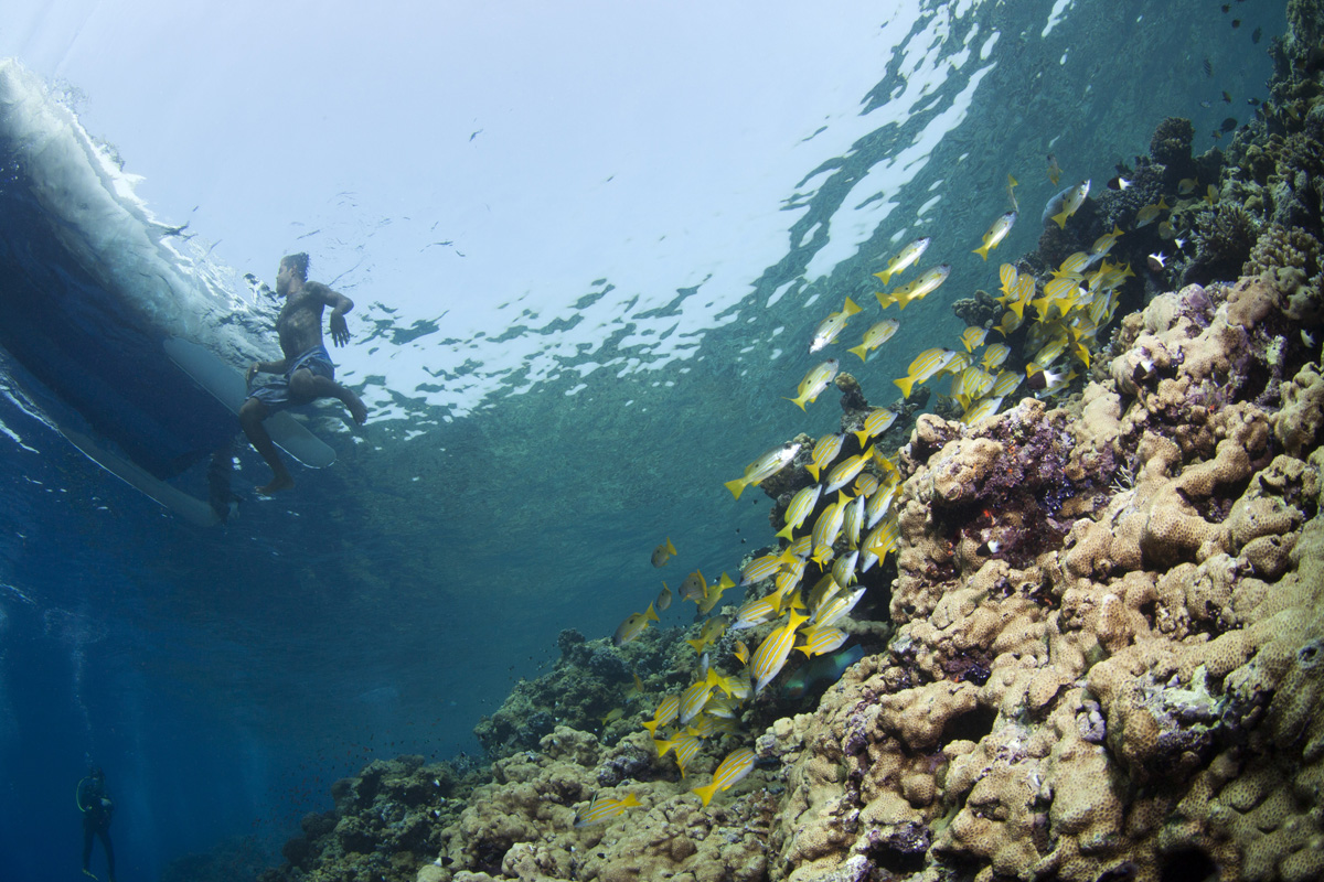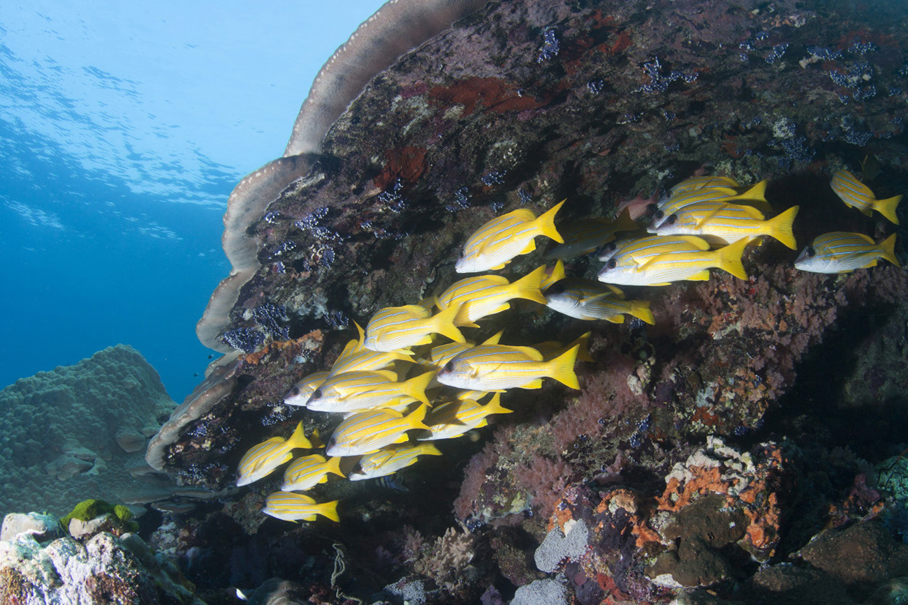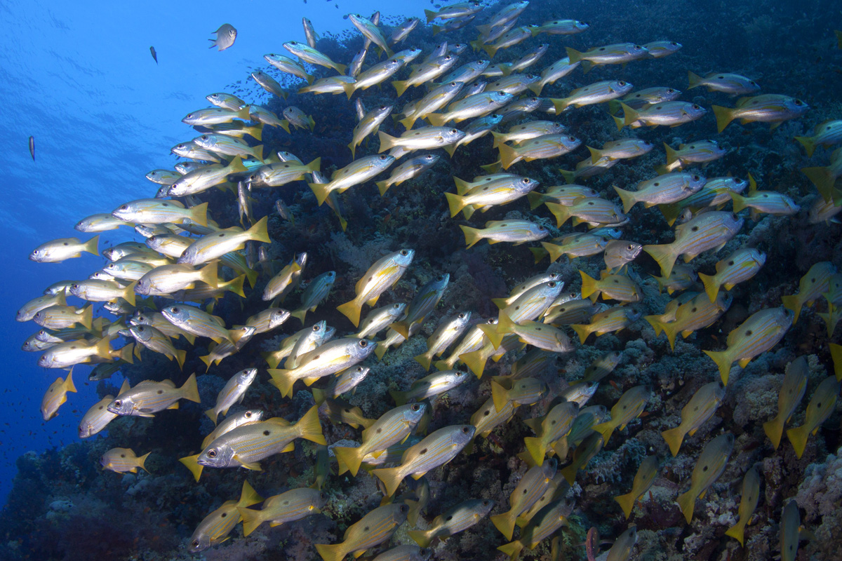 L'aggregazione compatta di un gruppo di pesci come nel caso degli azzannatori, ci permetterà di realizzare immagini particolarmente suggestive in quanto il soggetto principale del nostro scatto occuperà uno spazio importante all'interno dell'inquadratura. Sarà poi la vostra sensibilità di fotografi a decidere dove e come collocare il soggetto. Gli azzannatori sono perlopiù pesci timidi che dovranno essere avvicinati con molta attenzione per evitare di disturbarli e quindi farli fuggire. Una volta avvicinati al banco di pesci dovrete muovervi con estrema cautela evitando di pinneggiare nervosamente ma spostandovi con movimenti lenti che non disturbino gli animali. Per fare questo dovrete avere definito il vostro migliore assetto e concentrarvi esclusivamente sull'inquadratura. L'obiettivo più idoneo per riprendere il banco di Azzannatori sarà sicuramente il grandangolo. Come sempre è consigliato un primo scatto di prova per definire la migliore esposizione dopodichè dovrete concentrare tutta la vostra attenzione unicamente allo scatto finale. Fate molta attenzione all'orientamento del vostro flash in modo che copra il maggiore spazio possibile con il suo fascio luminoso a meno che non utilizziate 2 flash e a quel punto il problema non sussiste. Certamente l'ausilio della luce esterna che illumina il vostro soggetto vi sarà di aiuto per compensare le zone che non vengono raggiunte dal lampo del vostro flash così da ottenere una immagine che sia cromaticamente uniforme. In alternativa potrete sfruttare il controluce in modo che i raggi del sole penetrino e offrano al vostro scatto una maggiore scala cromatica. Queste saranno valutazioni che potrete fare in base a come è posizionato il gruppo di pesci. In ogni caso cercate comunque di sfruttare la luce esterna che vi sarà sempre utile. Se avete invece deciso di realizzare immagini ravvicinate l'impresa sarà sicuramente più ardua dato che dovrete avvicinarvi molto al soggetto ma non impossibile.