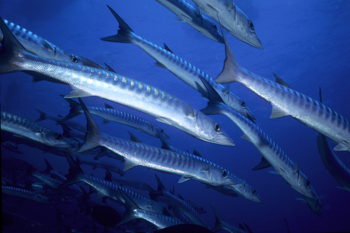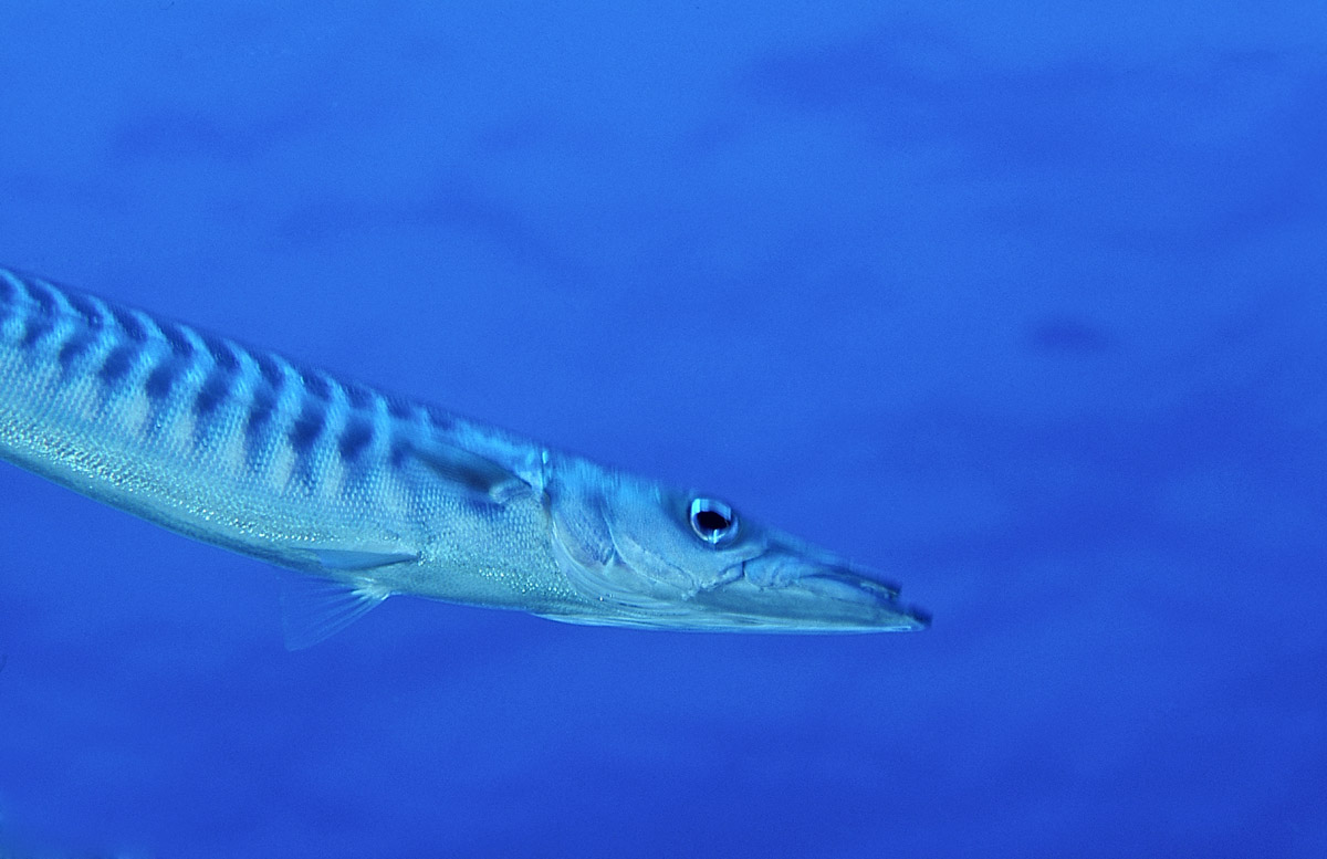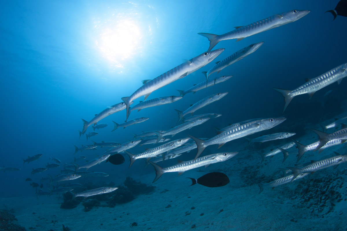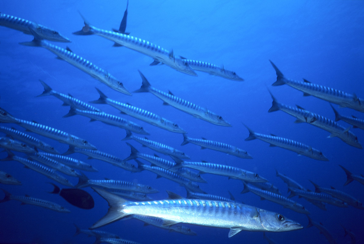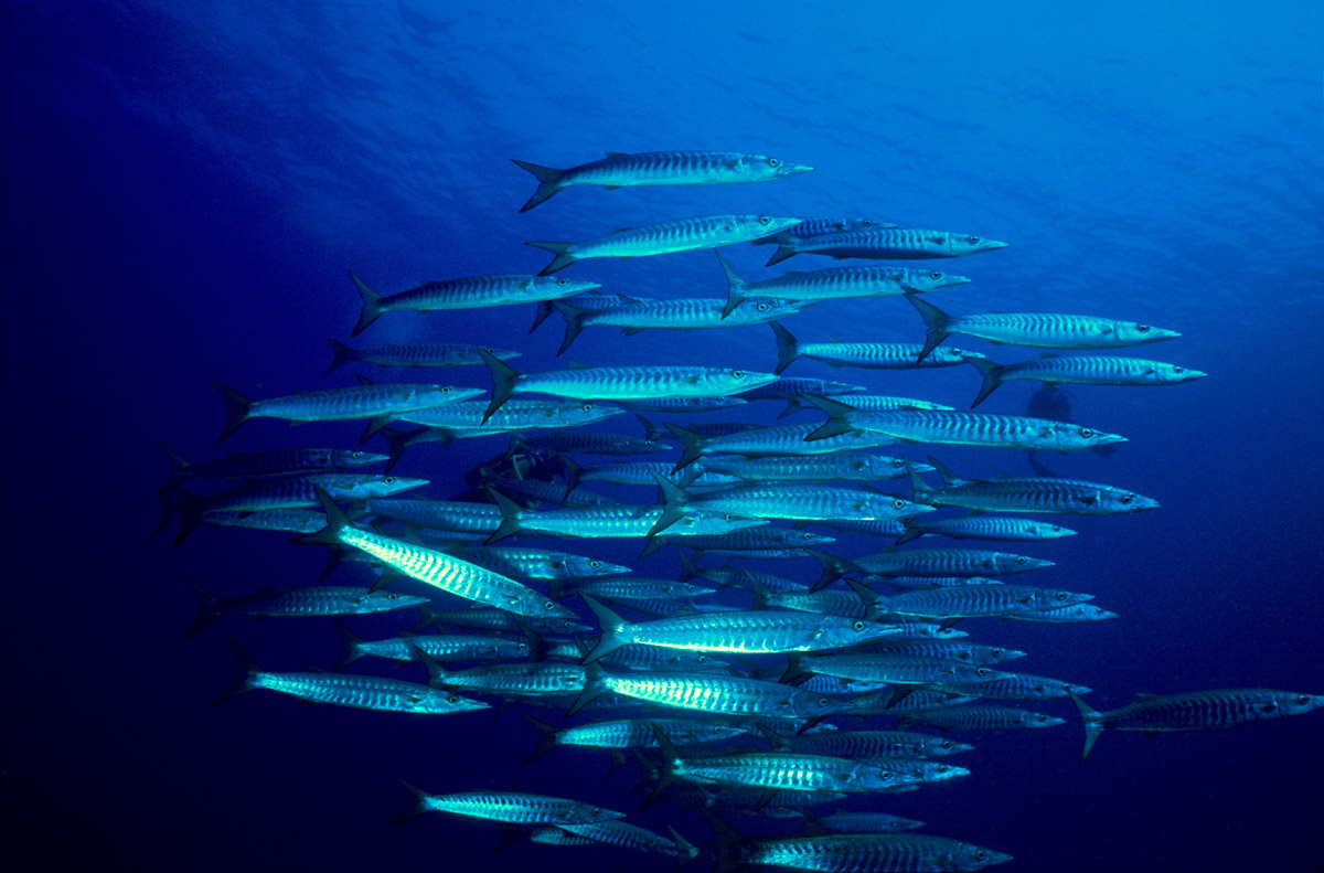Fotografare correttamente un branco di barracuda è sicuramente un ottimo esercizio in quanto ci si scontrerà con una serie di problematiche tecniche non indifferenti legate principalmente al corretto uso della luce. Il primo problema è dato dal colore argentato della livrea che tende, una volta colpito dalla luce del flash a riflettere inesorabilmente creando una macchia sparata di luce. Ovviamente il problema sussiste il momento in cui l'immagine viene realizzata a poca distanza dal soggetto e quindi il colpo di flash sarà abbastanza potente per colpire i pesci. Il tutto complicato dal fatto che i barracuda nuotano perlopiù in grossi branchi e quindi difficilmente controllabile la loro posizione. Fatta questa premessa possiamo tranquillamente affermare che per realizzare una buona immagine di barracuda, questi dovranno essere fotografati in branco facendo molta attenzione che il gruppo di pesci, prima dello scatto formi una massa omogenea e armoniosa. Capita molto spesso che i pesci cambino direzione e il gruppo che fino a pochi secondi prima era ordinato, assume forme disordinate e poco lineari. L'obiettivo ideale è sempre un grandangolo che permetta di riprendere tutto il branco lasciando un po' di spazio anche all'ambiente circostante o ancora meglio al blu del mare possibilmente con un bel controluce. In sintesi se si fotografa con una digitale con flash incorporato, difficilmente potrà essere utilizzato il colpo di flash della macchina, a quel punto molto meglio dedicarsi alla composizione dell'immagine sfruttando il controluce, in questo modo si eviterà di illuminare il plancton presente nell'acqua. Se invece disponete di una macchina in custodia con flash a parte, come dicevamo l'obiettivo migliore è sempre un grandangolo anche spinto. Se il branco si trova, come spesso accade a mezz'acqua potrete avvicinarvi con molta delicatezza verso il gruppo di pesci iniziando a scattare e facendo molta attenzione ad usare il flash come fonte di schiarita. Per fare ciò sarà importante tenere il flash laterale per evitare il riflesso sulla livrea e sempre dietro rispetto alla posizione della custodia. La vostra posizione dovrà essere frontale rispetto a quella dei dei pesci e mai troppo sotto se no rischiate di riprendere solo strisce scure senza forma.