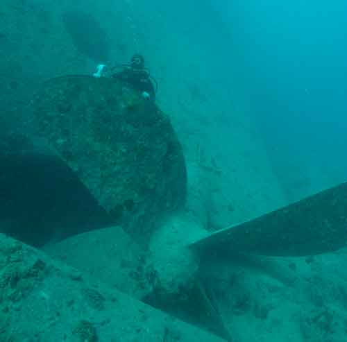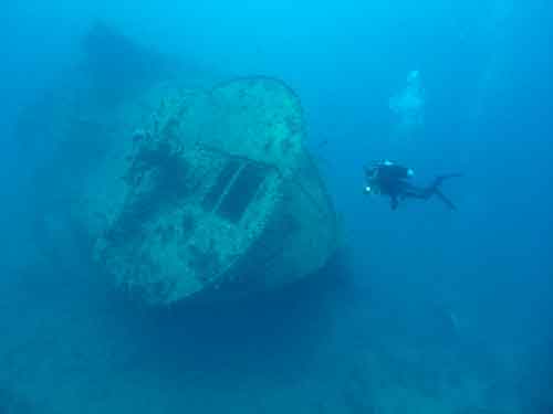 Arriviamo a Beacon Rock dove ci attende il relitto del Dunraven, che giace capovolto sul reef. Ci dirigiamo subito a poppa e da li penetriamo nella nave. Durante questo giro, mi volto per vedere se il mio compagno mi segue, ma mi trovo invece davanti una spropositata murena, alla quale decido di accordare diritto di precedenza per, diciamo così, residenti. Esaminato poi l’esterno ci stacchiamo dal relitto e riemergiamo. Da lì mettiamo la prua verso il famoso Sha’ab Abou Nahas, che offre quattro relitti d’eccezione l’uno affianco all’altro. Il primo che visitiamo è il Kimon M. anche di questo possiamo ammirarne gli interni , oltre che una splendida poppa, per poi farci salutare da un enorme barracuda prima di risalire. Dopo il pranzo è il turno del Chrisoula K., noto anche come “Relitto delle piastrelle”, visto il carico che trasportava e che peraltro è ancora tutto sul fondo. Facciamo anche un giro all’interno della sala macchine, davvero stupenda. Ma è all’uscita che ci attende una straordinaria sorpresa. Due delfini tursiopi stanno giocando sul fondo e, quando scendiamo da loro, restano a giocare con noi prima di sparire nel blu. L’emozione è visibile negli occhi di tutti. Una simpatica notturna con pesce coccodrillo chiude questa splendida giornata.