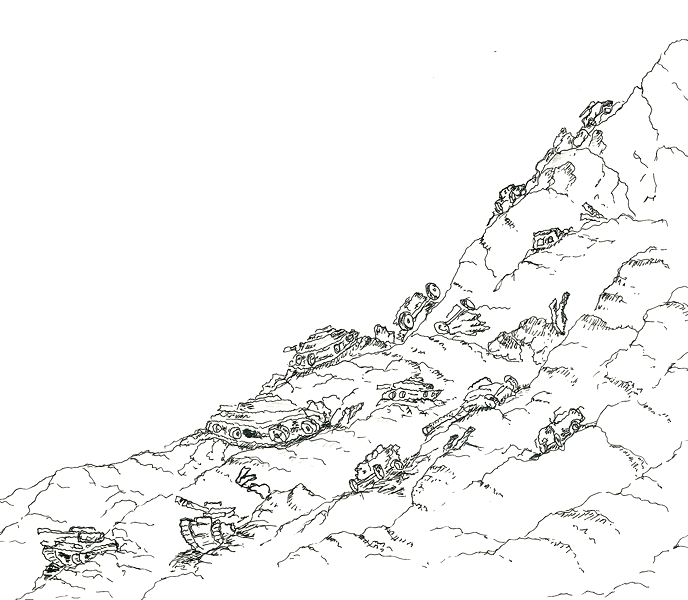 Una parete a picco che cade verticale con lunghe striature, come se qualcuno avesse gettato in mare dall’alto oggetti molto pesanti e voluminosi e questi avessero rapato la roccia segnandola profondamente. Profondità -15 metri con parete di roccia tutta franata senza coralli e pesce. Seguendo la caduta verso ovest compaiono i primi pezzi di rottami sparsi un po’ ovunque abbarbicati alle rocce: ruote di trattori militari, differenziali e ponti anteriori e posteriori di camion, un abitacolo… e poi la parete si riempie si riempie improvvisamente di mezzi militari, accatastati uno sopra l’altro, di cingolati interi e a pezzi, che si perdono verso le grandi profondità. I primi relitti si trovano a -30 metri di profondità. Nella caduta (è evidente che tutti quei veicoli militari sono stati buttati giù dall’alto della rupe) qualche automezzo si è fermato contro una roccia sporgente che ha resistito all’urto, ma gli altri, buttati dopo devono avere proseguito verso il fondo. Aggirandosi tra questi relitti viene in mente immediatamente il conflitto tra egiziani e israeliani e si vedono almeno una ventina di cingolati (trasporto truppe) di produzione dei paesi dell’est, russi o cecoslovacchi (si distinguono dai mezzi inglesi o americani poiché sono a cielo aperto) e anche un automezzo con le ruote anteriori e i cingoli sotto il cassone. Tra le lamiere compare pure un cannone dalla canna lunghissima, tipo 88 tedesco. Tutti questi mezzi sono in posizione instabile lungo la franata e pericolosamente appoggiati con il rischio di cadere. Il primo carro armato è un mezzo leggero, forse di fabbricazione inglese, niente a che fare con i poderosi T-34 oppure con i T-54 costruiti in Russia.