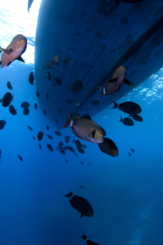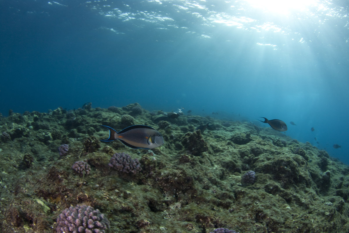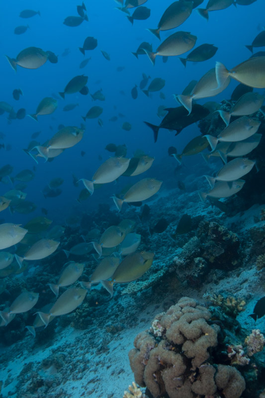 Imbattersi nei pesci chirurgo non è certo difficile dato che li potremo incontrare solitari o in gruppo mentre "pascolano" sul cappello del reef oppure mentre nuotano lungo le pareti della barriera, oppure ancora sui fondali sabbiosi o nel blu in piccoli o ricchi banchi sempre intenti a nutrirsi. E' talmente vasta e ricca la famiglia dei chirurgo che basterà cercarli per incontrarne qualcuno. Considerata la vastità della specie è chiaro che sono diverse anche le loro abitudini e caratteristiche. Per esempio il tipico chirurgo del Mar Rosso denominato anche "chirurgo arabo" Acanthurus sohal, quello con la livrea caratterizzata da striature orizzontali blu e grigie lungo tutto il corpo, che popola le estremità esterne delle piattaforme coralline esposte alla corrente, è un pesce abbastanza difficile da avvicinare per via del continuo movimento a cui è soggetto. La colorazione della sua livrea è molto bella e facilmente fotografabile, bisognerà avere solo un po' di fortuna di incontrarlo mentre è intento alla ricerca di cibo e poi scattare. Considerando che il chirurgo arabo lo si incontra in basse profondità sarà importante bilanciare correttamente l'esposizione in modo da sfruttare al massimo la luce esterna e dare un minimo colpo di flash sul soggetto. Un po' diversa è invece la situazione del chirurgo a bande nere (Acanthurus gahhm) o il pesce chirurgo vela (Zebrasoma desjardinii) facilmente avvistabili soprattutto mentre si aggirano intorno alla chiglia della barca o in banchi più o meno ricchi mentre nuotano o intenti ad alimentarsi nel blu. Oppure ancora i pesci unicorno (Naso hexacanthus e il Naso unicornis) anche loro dalla livrea scura.Tutti abbastanza impegnativi da illuminare correttamente per via della loro livrea scura che assorbe grossa quantità di luce. Sfruttare il controluce sarà sicuramente una buona soluzione per ottenere una immagine d'ambiente, al contrario se la sagoma del pesce dovesse trovarsi su uno sfondo scuro l'immagine finirebbe per essere meno di effetto. Un grandangolo medio sarà più che sufficiente sempre che ci si riesca ad avvicinare abbastanza al soggetto. Sarà necessario effettuare l'esposizione sulla livrea del pesce e poi bilanciare con il resto della scena. Se i pesci si trovano a bassa è possibile anche scattare a luce ambiente ottenendo comunque un buon effetto scenografico.