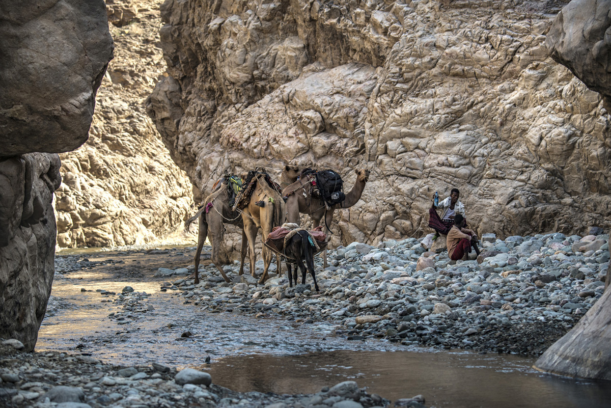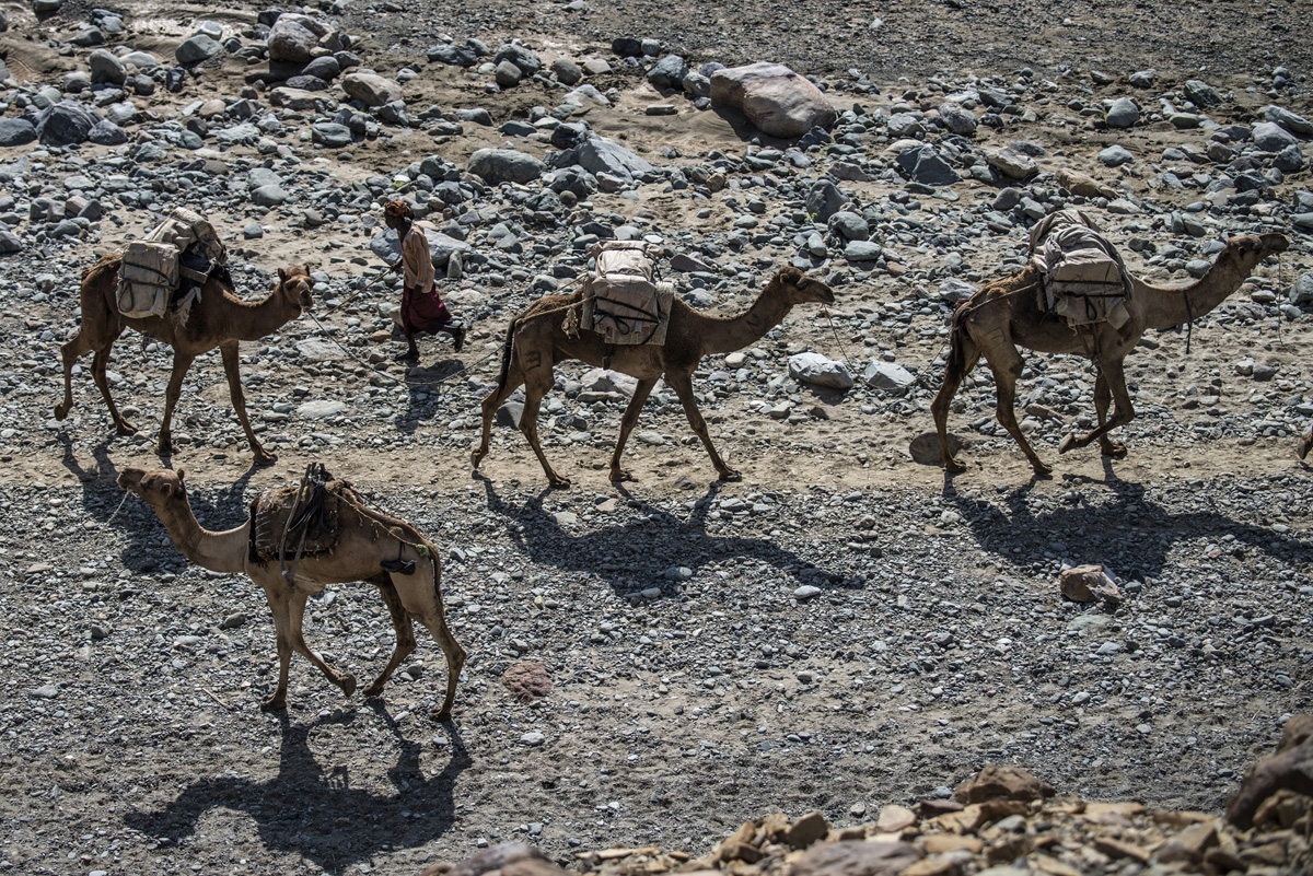 Lungo il greto del fiume affrontiamo un trekking di 15 chilometri durante il quale incrociamo infinite carovane di cammelli cariche di sale che da centinaia di anni percorrono avanti e indietro questo tragitto.