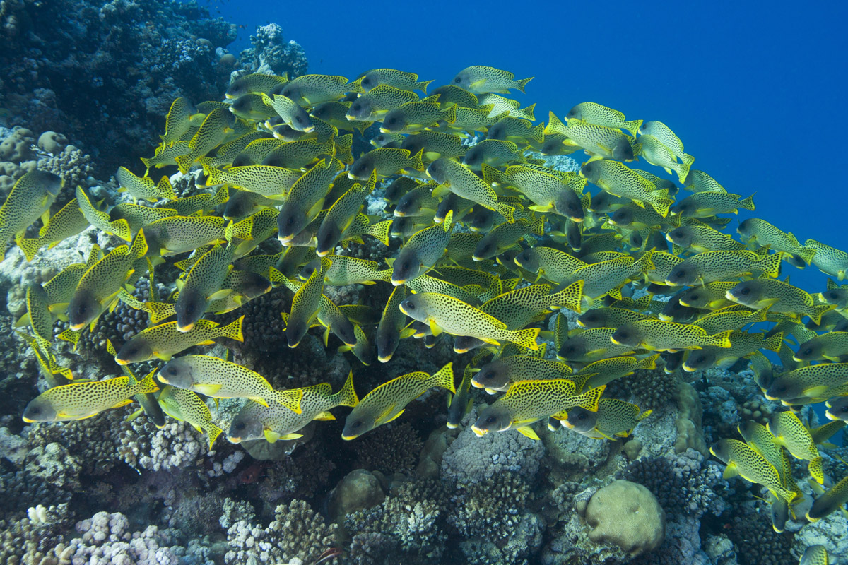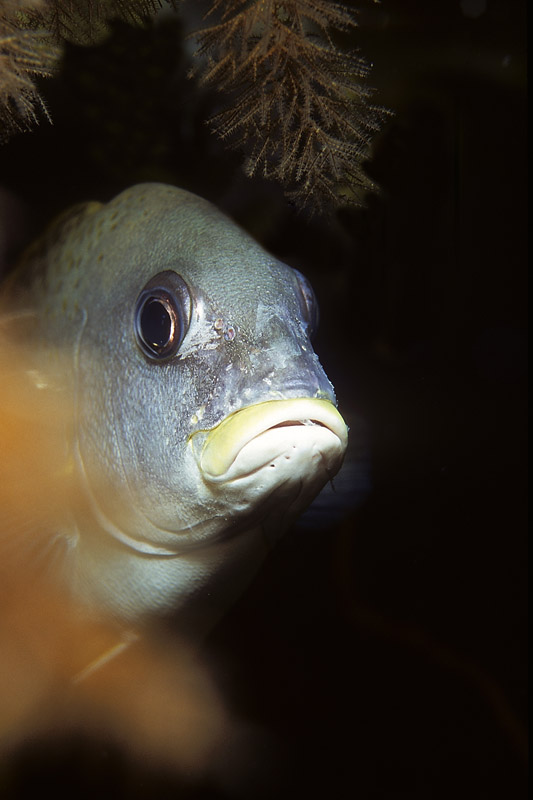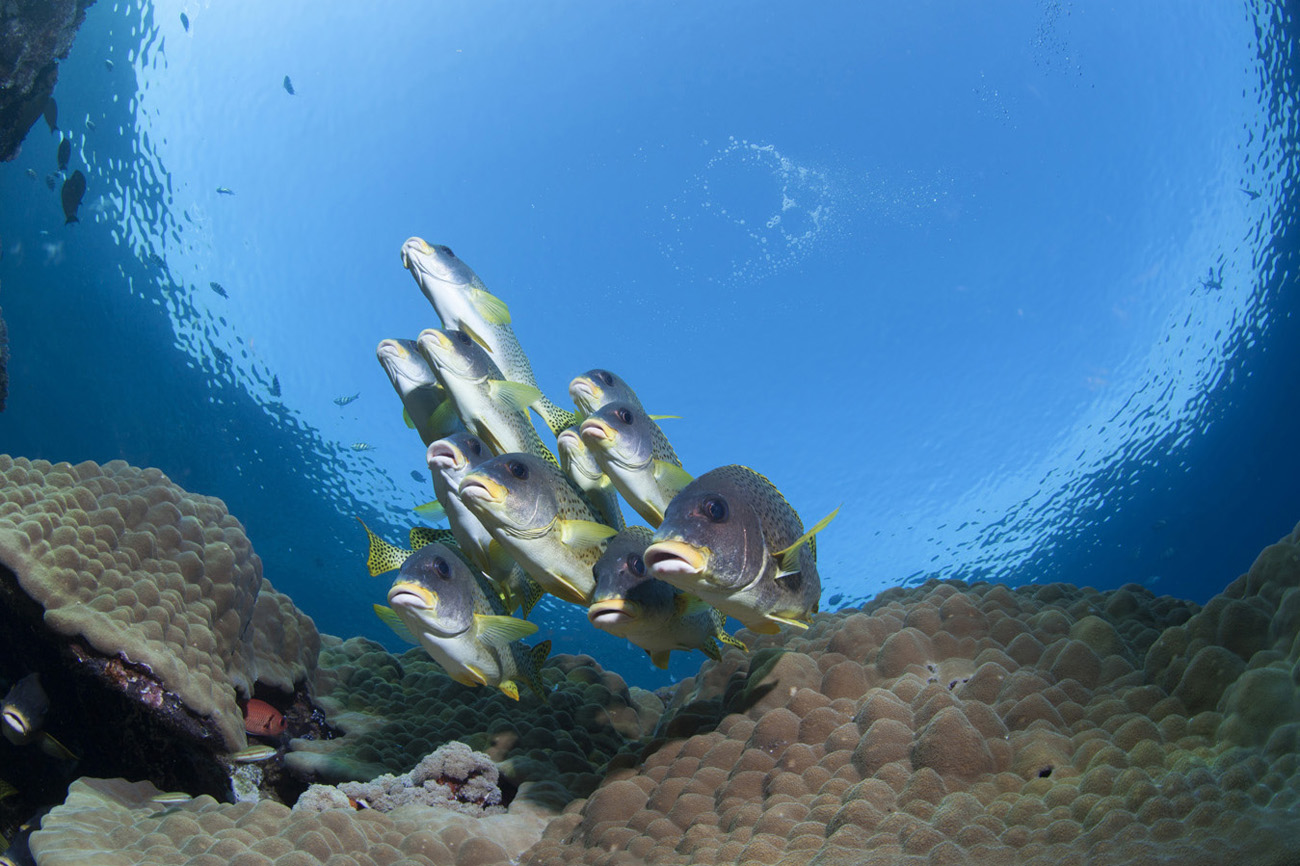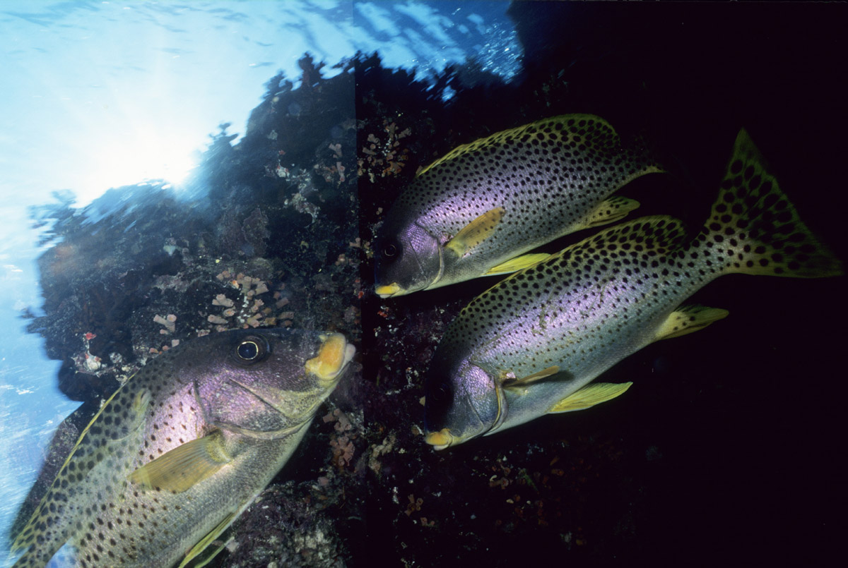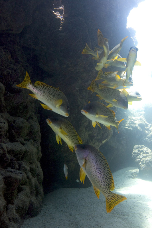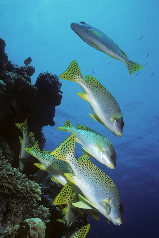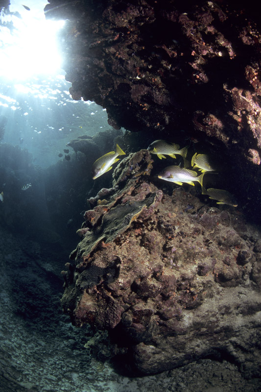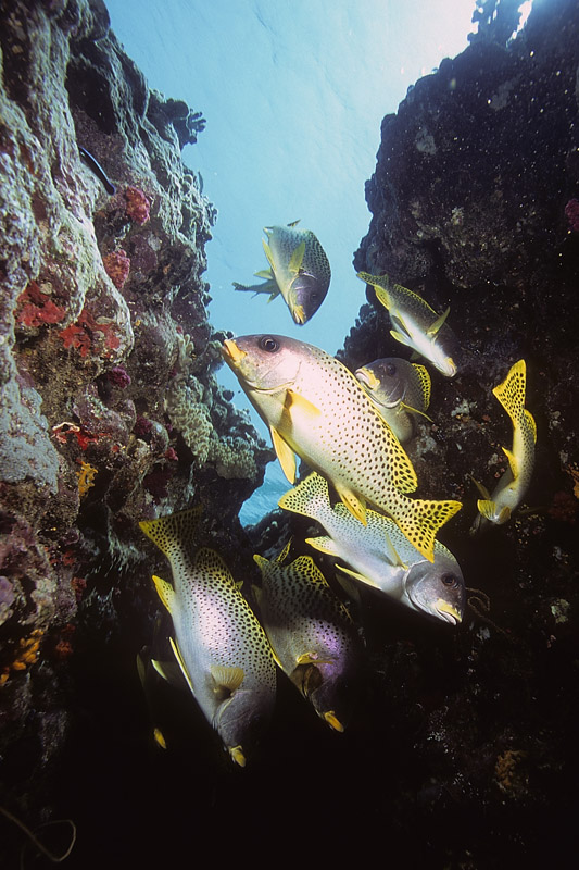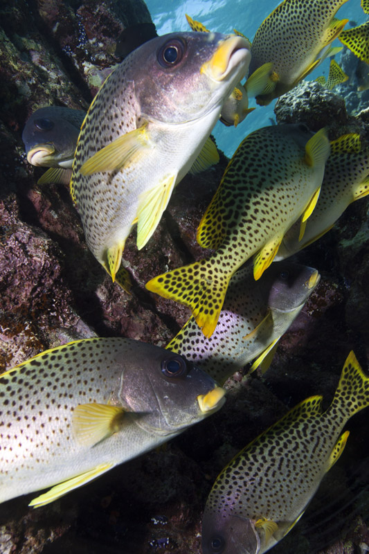 Il dolcilabbra è certamente un ottimo soggetto che ci offre la possibilità di sbizzarrire il nostro estro fotografico con la garanzia di ottenere belle immagini. Certo nulla succede per caso quindi, come abbiamo ripetutamente scritto, saranno le nostre capacità compositive in primis a fare si che si possano realizzare buoni scatti. E' grazie alle sue caratteristiche di pesce prevalentemente statico e pigro che potremo muoverci intorno a lui senza farlo fuggire. Inoltre il dolcilabbra può essere incontrato in situazioni differenti quasi tutte stimolanti dal punto di vista fotografico. All'interno di anfratti che ci permetteranno di sfruttare anche i raggi di luce che penetrano dall'esterno, oppure all'ombra di un tetto madreporico rivestito di alcionari colorati oppure ancora in banchi sospesi nel blu e altre situazioni interessanti. Questo privilegio deve essere usato positivamente in modo da concentrarci sulla qualità del risultato finale. Potranno essere utilizzati diversi obiettivi in base all'interesse di chi fotografa: dall'obiettivo ravvicinato al grandangolo più spinto. L'utilizzo corretto della luce flash compensata dalla luce esterna ci darà la possibilità di illuminare il soggetto in modo più omogeneo. Una volta definito l'assetto corretto potete concentrarvi sull'inquadratura che ritenete migliore cercando, se possibile, di sfruttare anche la luce proveniente dalla superficie. Non abbiate timore di avvicinarvi al soggetto ma fatelo con molta calma in modo da abituare i pesci alla vostra presenza. Verificate la corretta esposizione con un primo scatto di prova in modo poi da non dovervi più preoccupare dell'esposizione dedicandovi esclusivamente all'inquadratura. Attenzione alle forti ombre che si creano quando si fotografano molti pesci ravvicinati e il colpo di flash rischia di generare fastidiose ombre che andranno poi a riflettersi sulla livrea del pesce vicino.