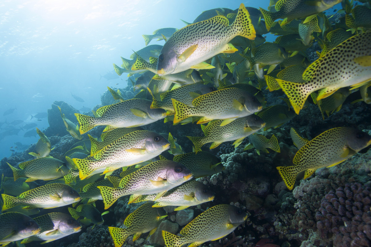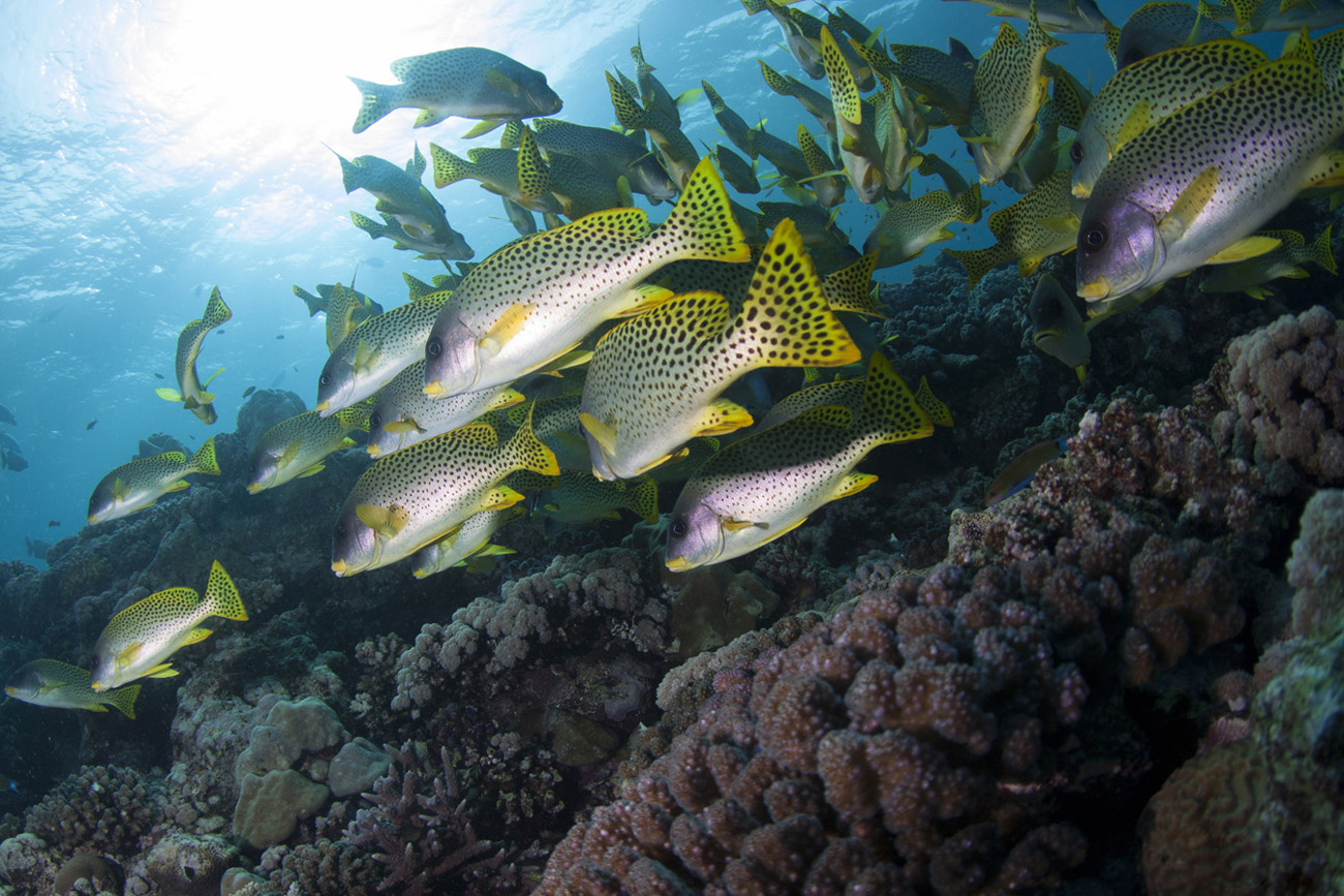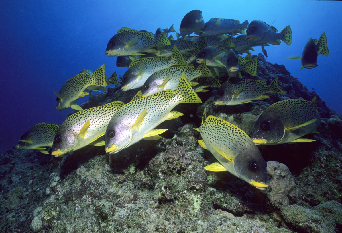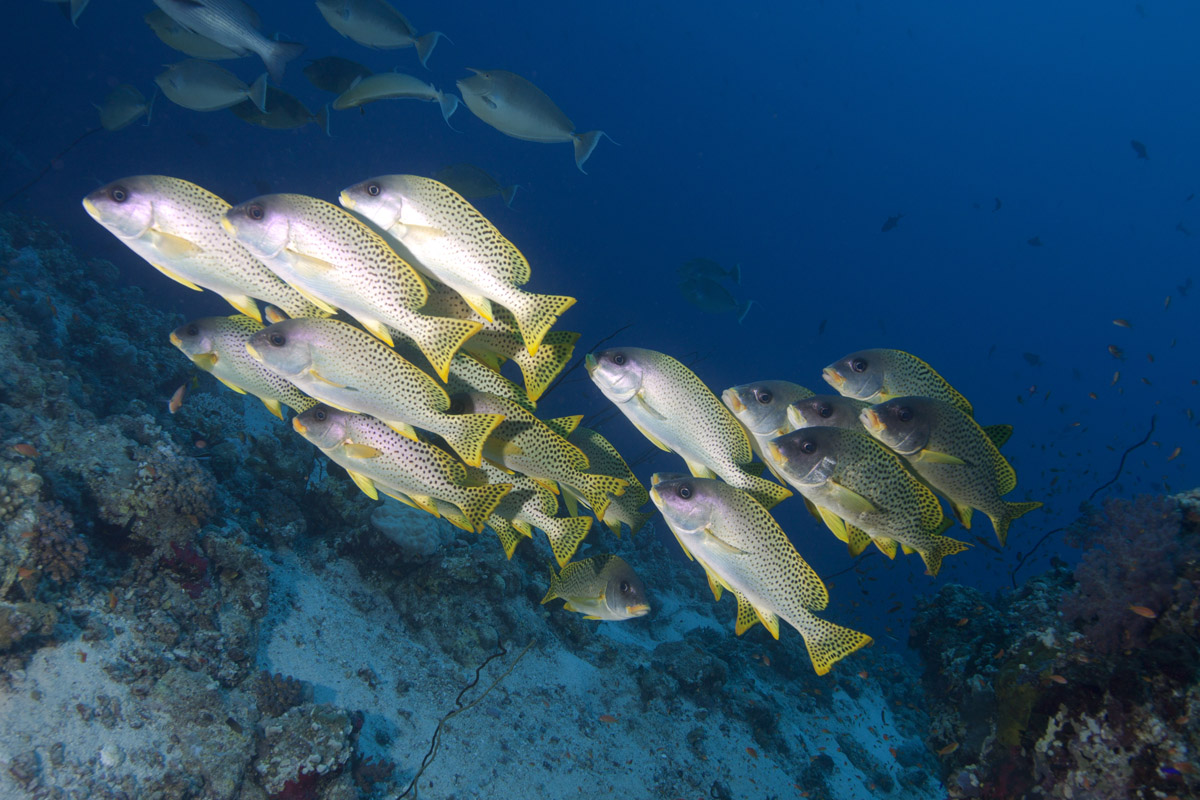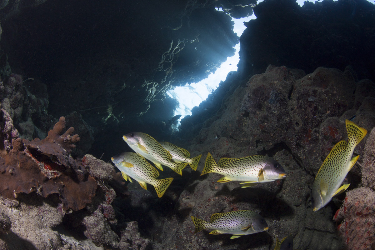Il dolcilabbra è certamente un ottimo soggetto che ci offre la possibilità di sbizzarrire il nostro estro fotografico con la garanzia di ottenere belle immagini. Certo nulla succede per caso quindi, come abbiamo ripetutamente scritto, saranno le nostre capacità compositive in primis a fare si che si possano realizzare buoni scatti. E' grazie alle sue caratteristiche di pesce prevalentemente statico e pigro che potremo muoverci intorno a lui senza farlo fuggire. Inoltre il dolcilabbra può essere incontrato in situazioni differenti quasi tutte stimolanti dal punto di vista fotografico. All'interno di anfratti che ci permetteranno di sfruttare anche i raggi di luce che penetrano dall'esterno, oppure all'ombra di un tetto madreporico rivestito di alcionari colorati oppure ancora in banchi sospesi nel blu e altre situazioni interessanti. Questo privilegio deve essere usato positivamente in modo da concentrarci sulla qualità del risultato finale. Potranno essere utilizzati diversi obiettivi in base all'interesse di chi fotografa: dall'obiettivo ravvicinato al grandangolo più spinto. L'utilizzo corretto della luce flash compensata dalla luce esterna ci darà la possibilità di illuminare il soggetto in modo più omogeneo. Una volta definito l'assetto corretto potete concentrarvi sull'inquadratura che ritenete migliore cercando, se possibile, di sfruttare anche la luce proveniente dalla superficie. Non abbiate timore di avvicinarvi al soggetto ma fatelo con molta calma in modo da abituare i pesci alla vostra presenza. Verificate la corretta esposizione con un primo scatto di prova in modo poi da non dovervi più preoccupare dell'esposizione dedicandovi esclusivamente all'inquadratura. Attenzione alle forti ombre che si creano quando si fotografano molti pesci ravvicinati e il colpo di flash rischia di generare fastidiose ombre che andranno poi a riflettersi sulla livrea del pesce vicino.