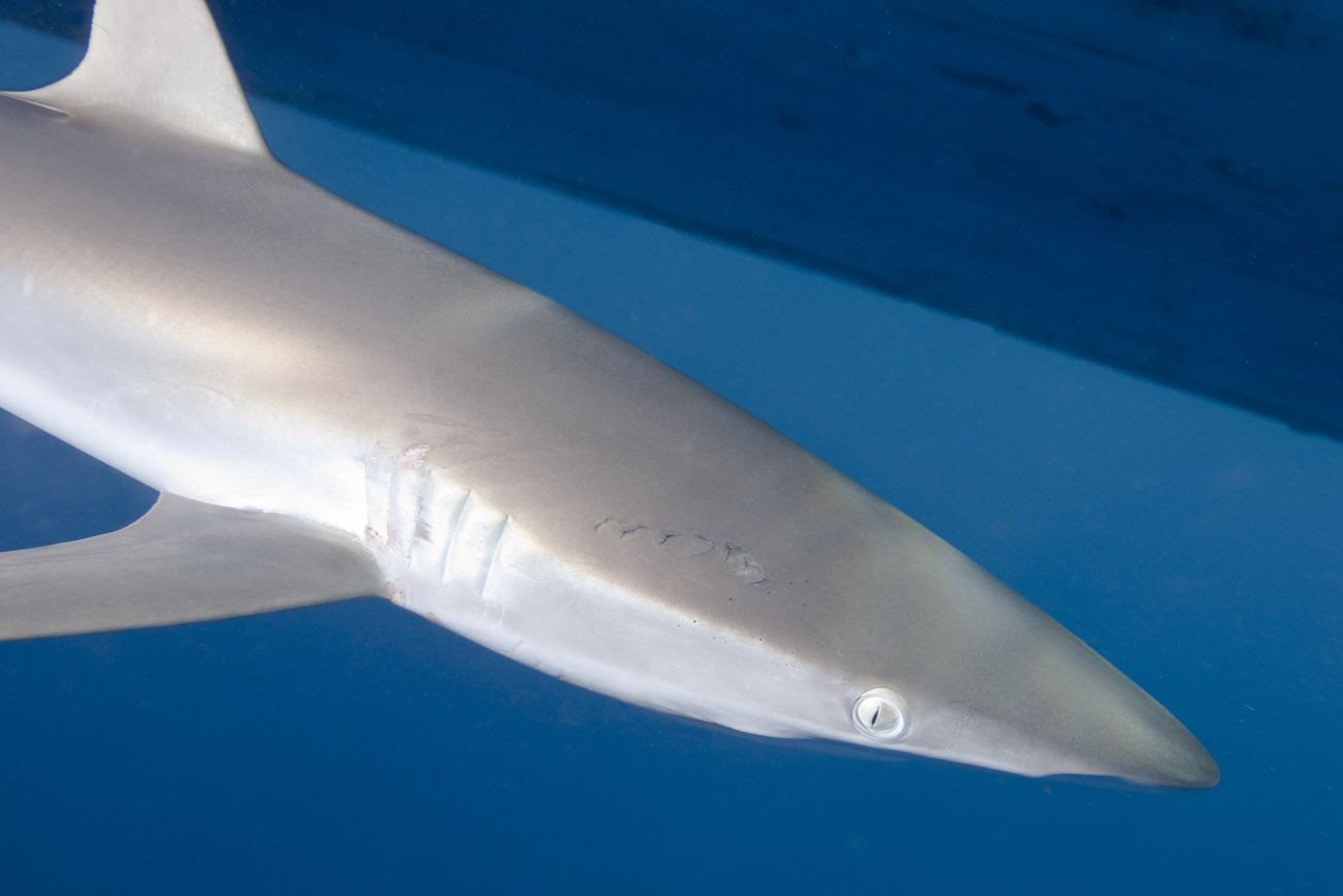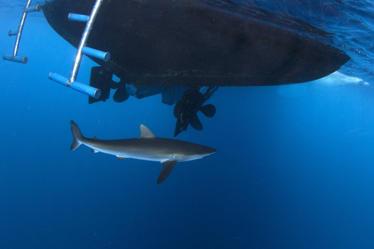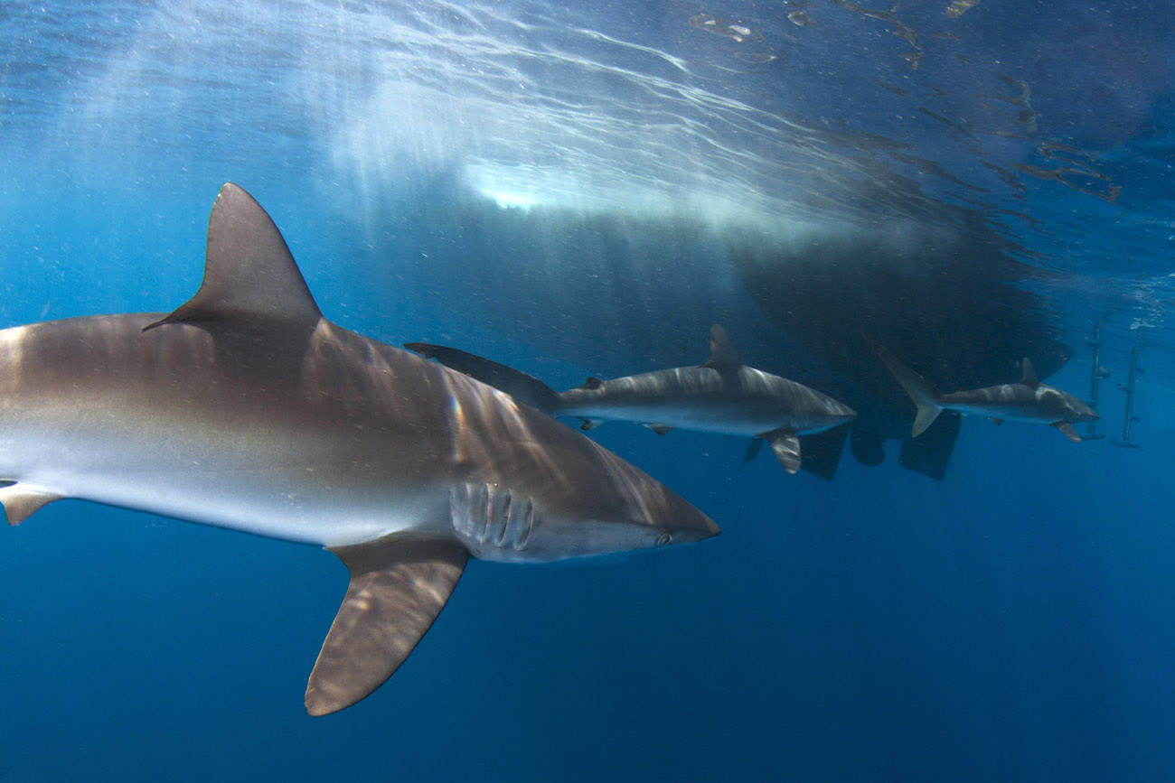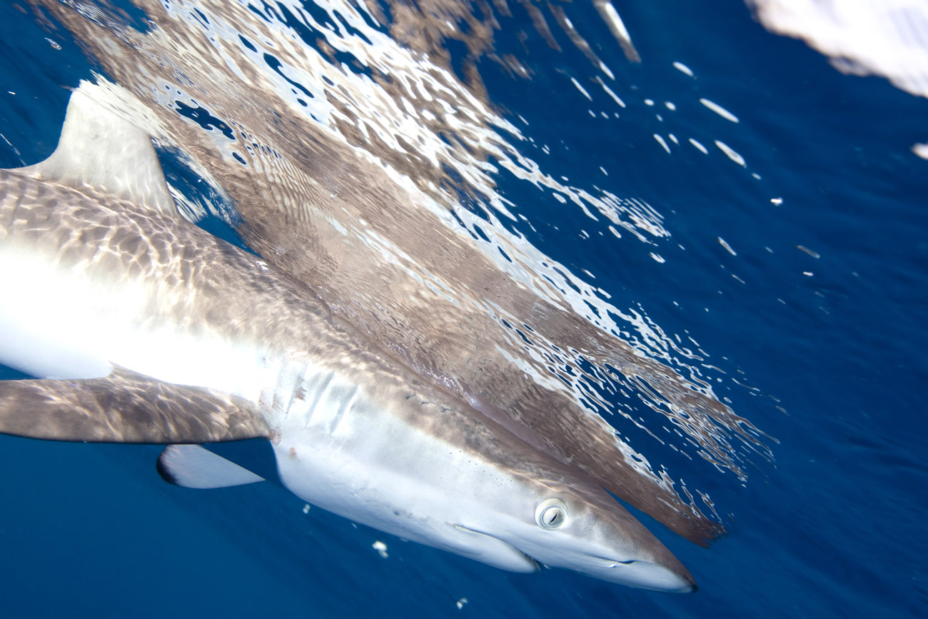 Lo squalo seta non si annuncia, si materializza sotto la superficie dell’acqua e inizia la sua danza.