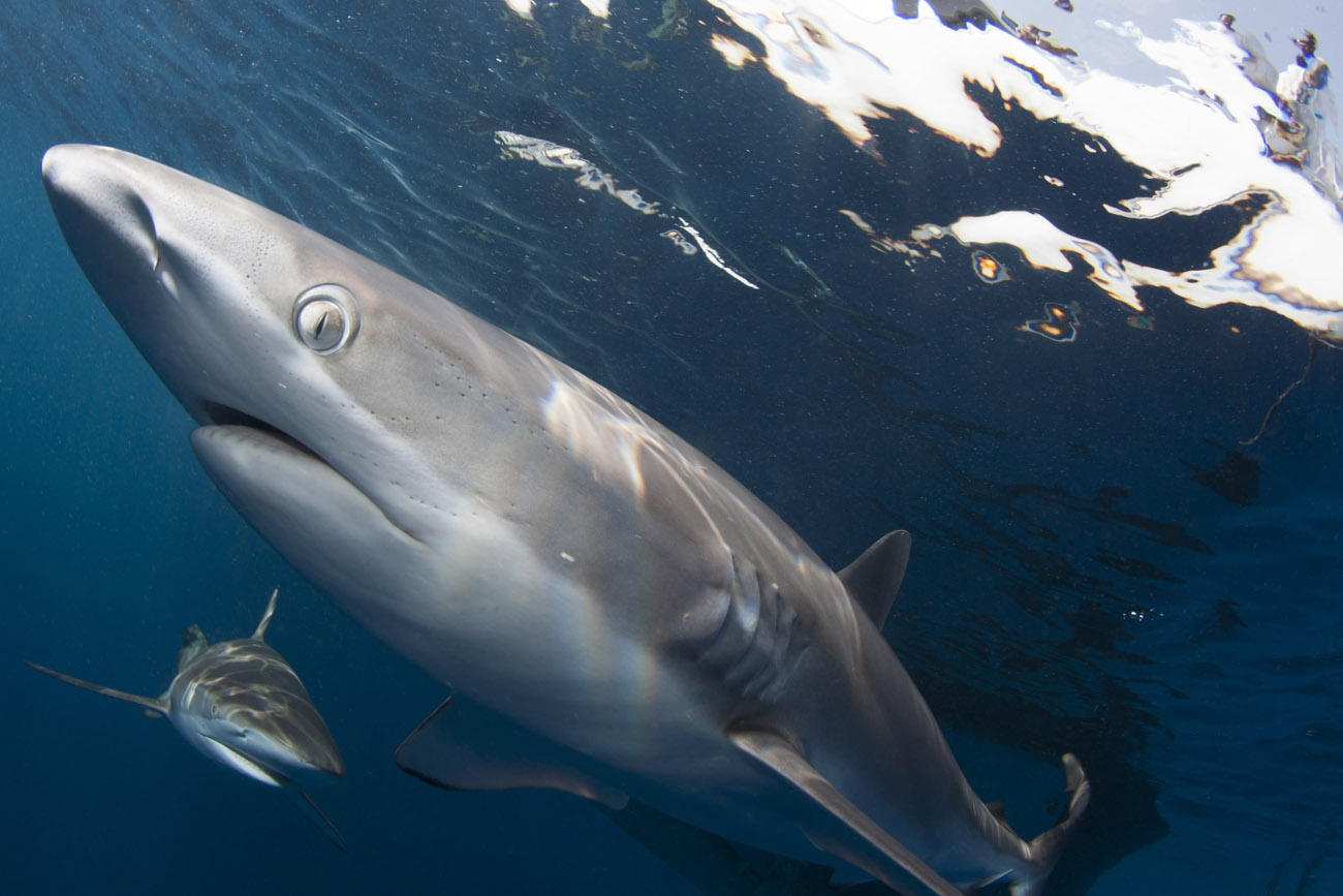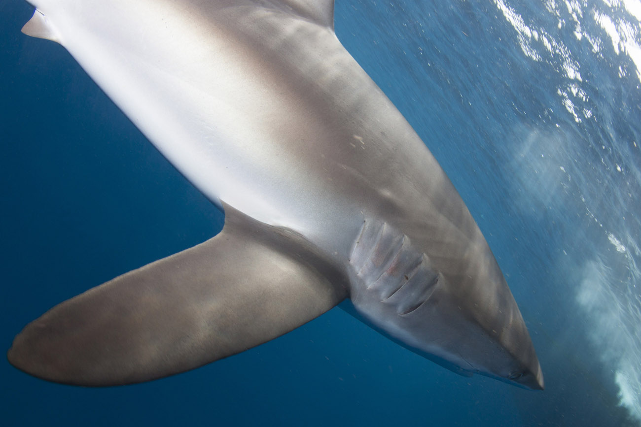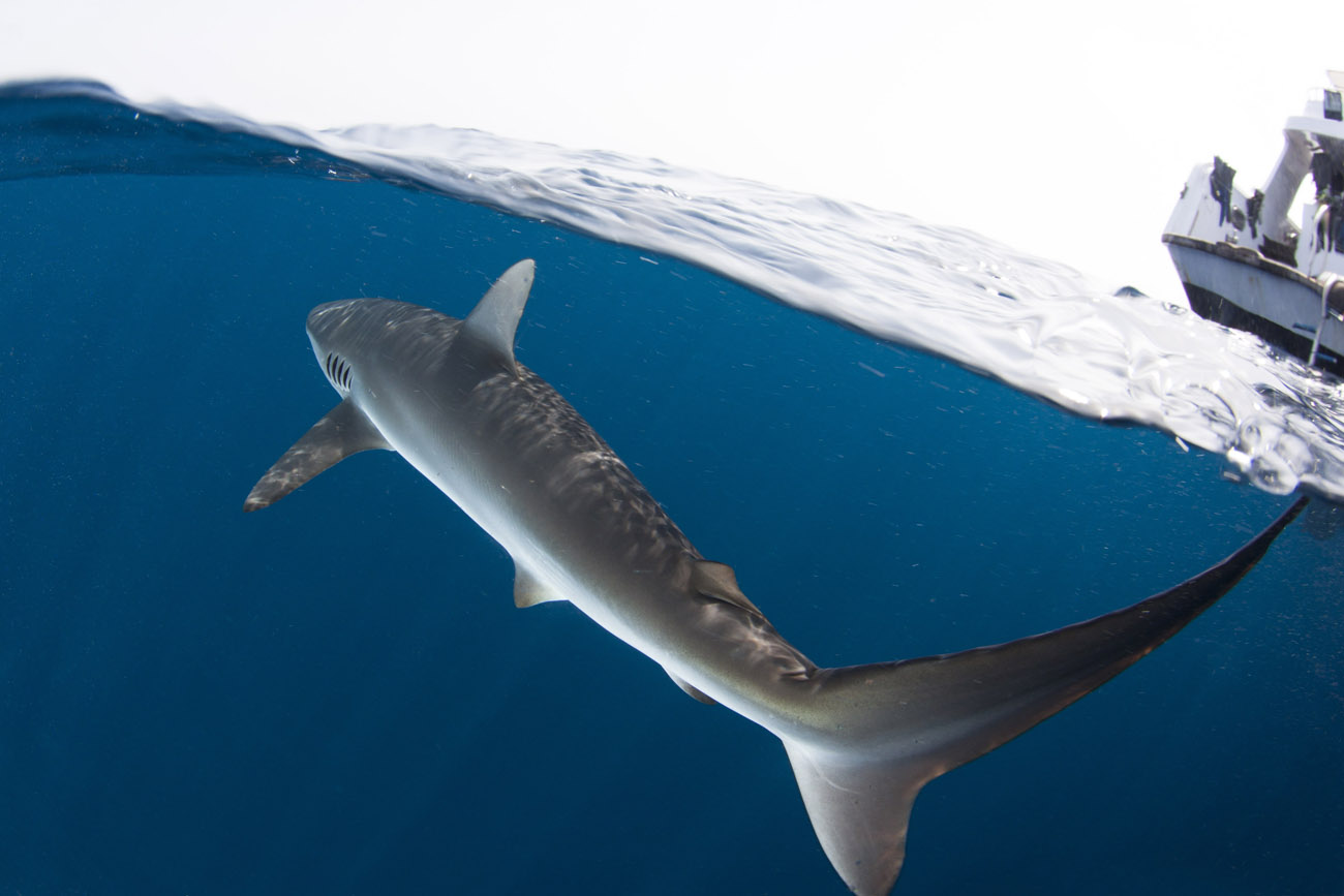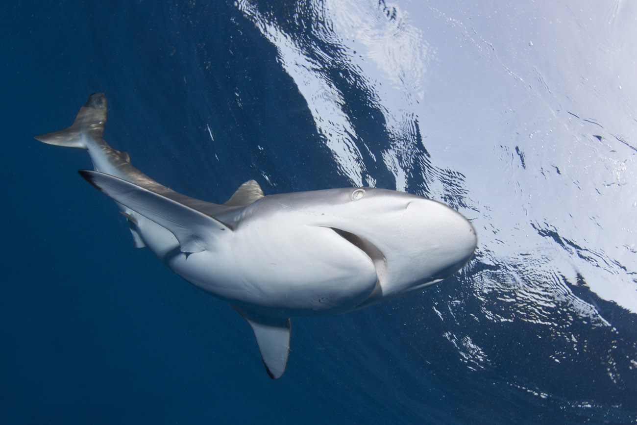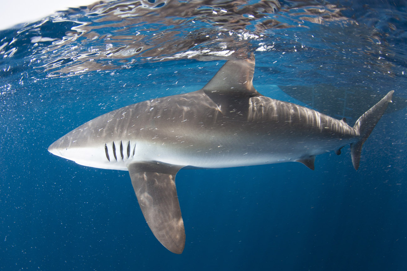 Lo squalo seta non si annuncia, si materializza sotto la superficie dell’acqua e inizia la sua danza.