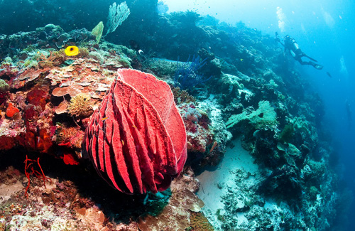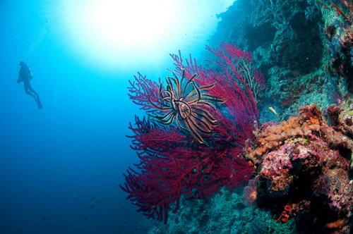 Fondali straordinari con magnifici coralli duri, alcionari, gigantesche spugne a imbuto, gorgonie colonizzate da crinoidi sgargianti sono state le quinte perfette per immagini d’ambiente, ma mi diverto anche a cercare di fotografare il delizioso cavalluccio pigmeo, gli innumerevoli nudibranchi, granchietti a me sconosciuti che la nostra eccellente guida andava a scovare con occhio prodigioso.
