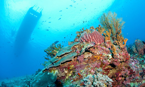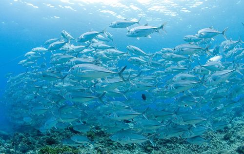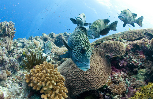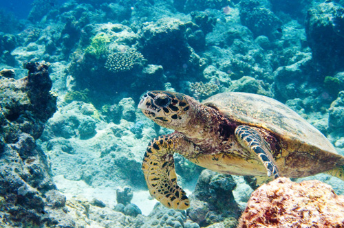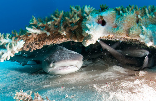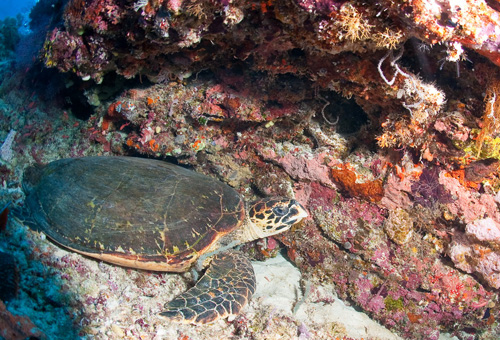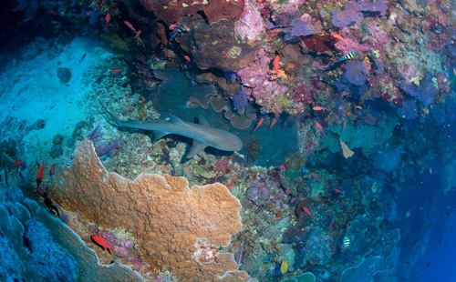 Dopo questo inizio promettente, le cinque immersioni al giorno in programma ci offrono emozioni di ogni genere. Evoluzioni di eleganti mante nell’atollo Nord, un solitario, enorme martello, il rarissimo pesce vela ma soprattutto un placido squalo balena, insolitamente a passeggio a venti metri di profondità, che ci ha concesso una lunga pinneggiata in sua compagnia prima di allontanarsi verso l’oceano aperto. Poi tartarughe, branchi di carangidi, cernie, napoleoni, tutto il pesce di barriera che si può immaginare e miriadi di squali: dalle famiglie di pinna bianca con microscopici, tenerissimi cuccioli ai branchi di grigi perennemente in caccia.