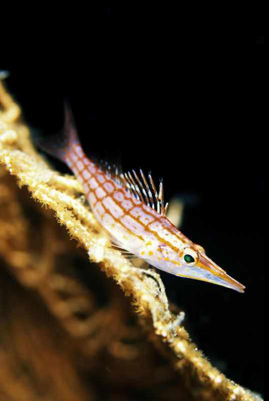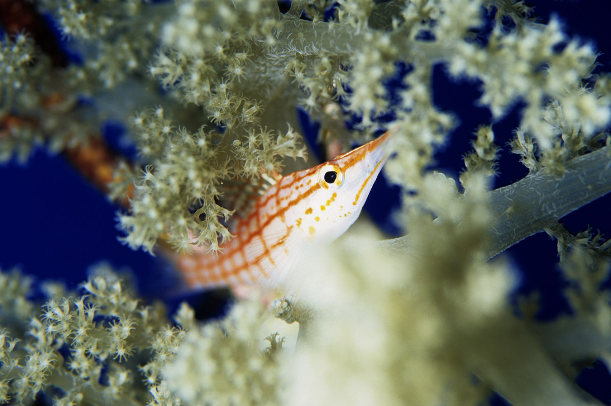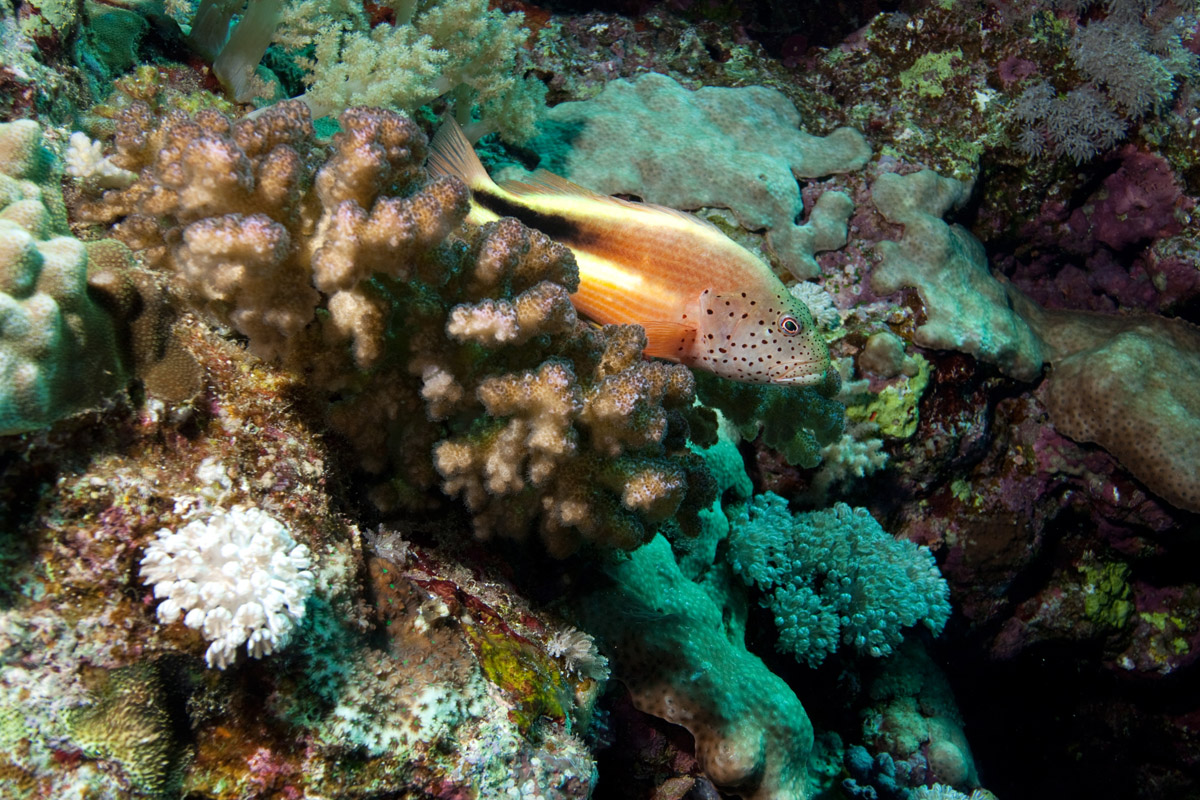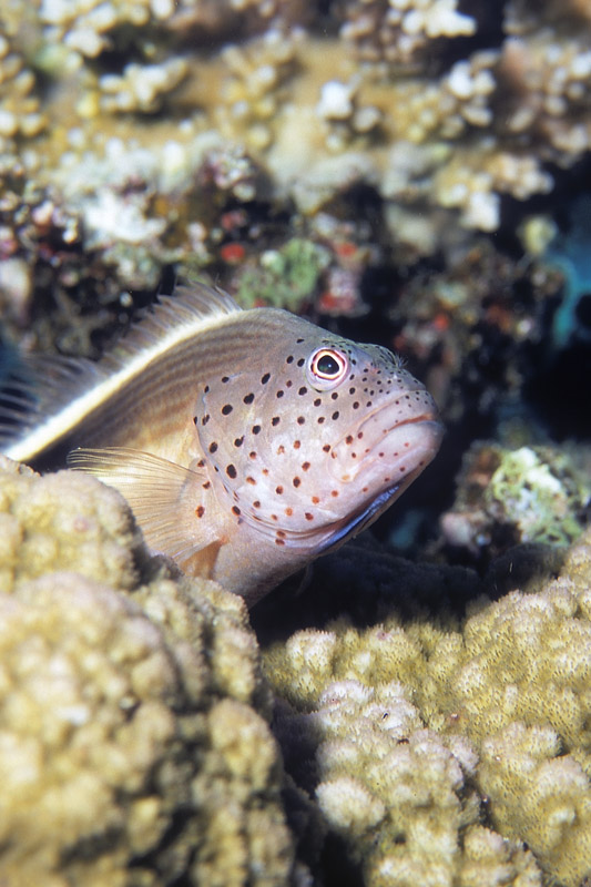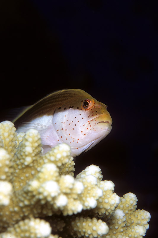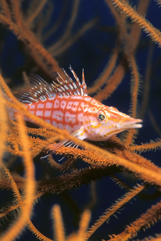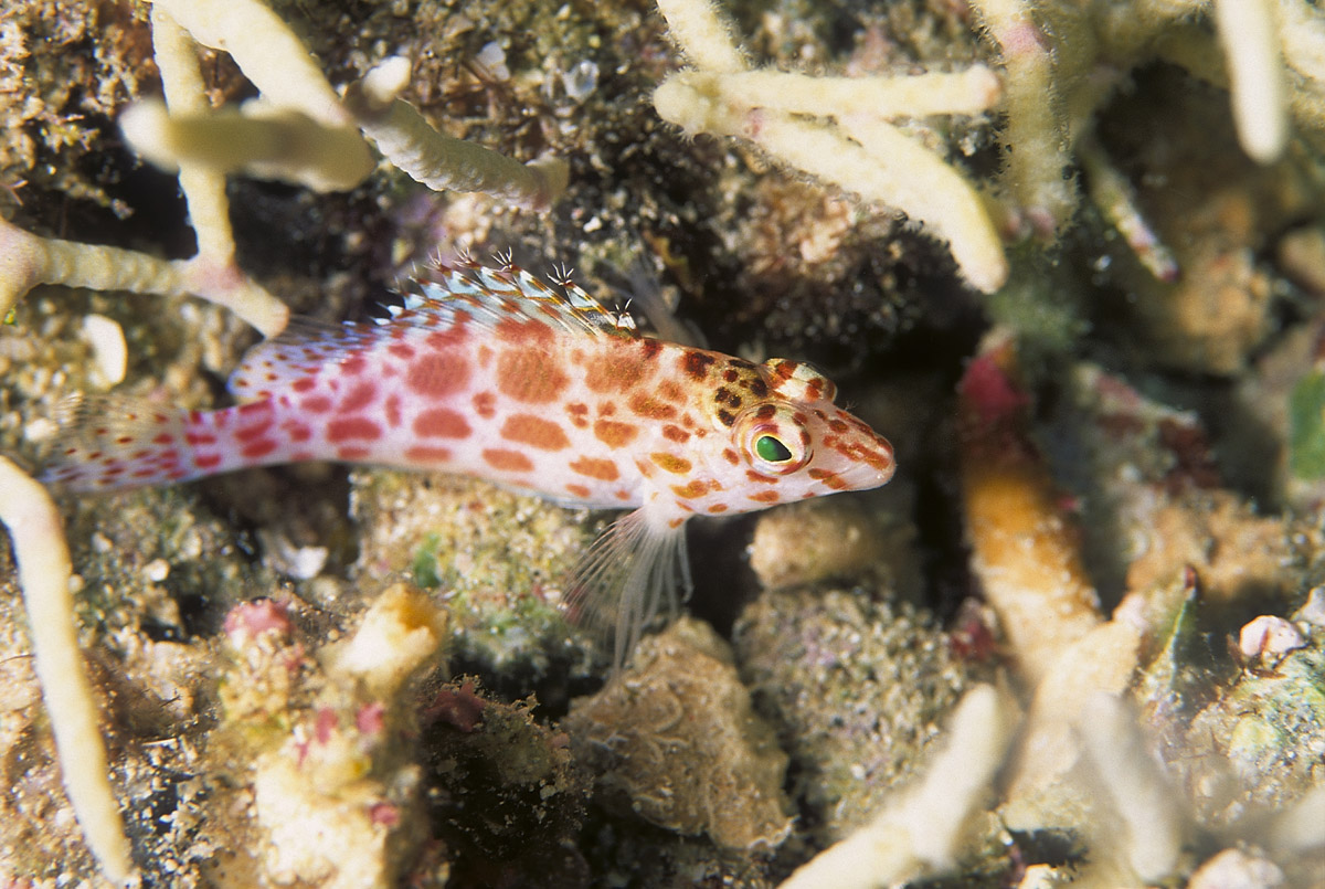 Per loro indole e caratteristiche biologiche si prestano benissimo a primi piani, le pinne pettorali permettono al pesce falco (altra famosissima specie che sicuramente avrete visto appoggiata "in agguato" sul corallo di fuoco è il Paracirrhites fosteri, il pesce falco di Foster dal tipico ventre chiaro e muso punteggiato) di appoggiarsi alle madrepore per monitorare la zona di caccia per poi piombare come fosse un rapace sulla preda. Questo significa che osservandolo da lontano e avvicinandosi con molta delicatezza ci si può portare a brevi distanze per una buona osservazione, e con molta pazienta e un pizzico di fortuna potremmo vederlo mentre si lancia sulla sua preda.