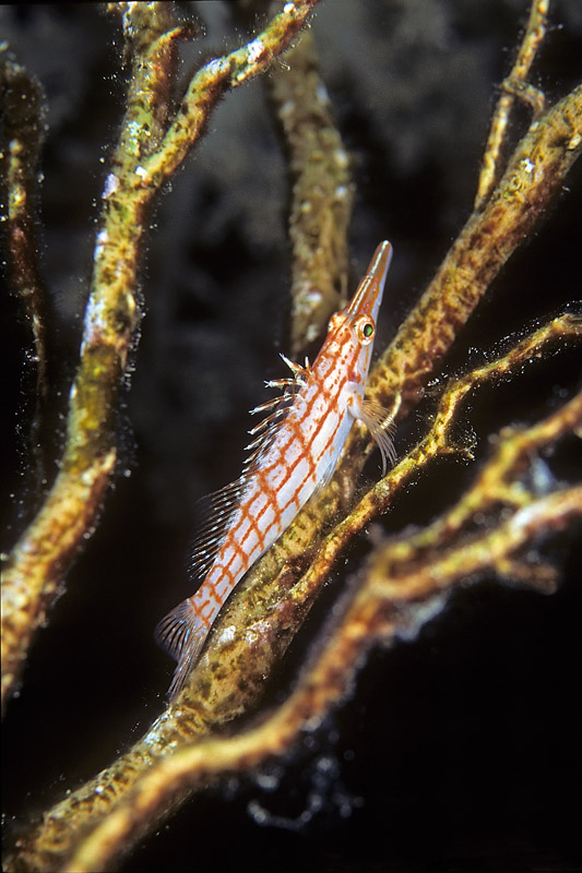 Alla distribuzione batimetrica sopra indicata fa decisamente eccezione uno dei pesci falco più conosciuti e rinomati del Mar Rosso, Oxycirrhites typus, il pesce falco delle gorgonie, che avendo evoluto una colorazione che lo rende fortemente mimetico proprio tra i rami delle grandi gorgonie o del corallo nero, difficilmente verrà osservato al di sopra dei 30 metri di profondità.