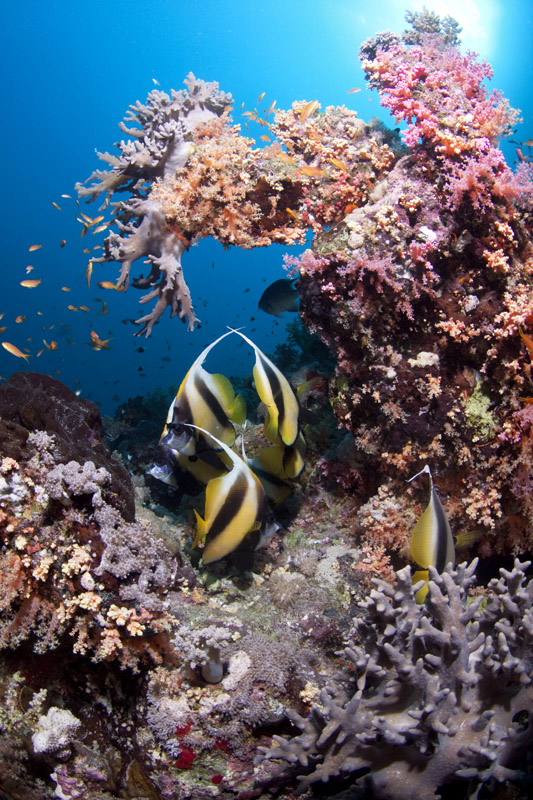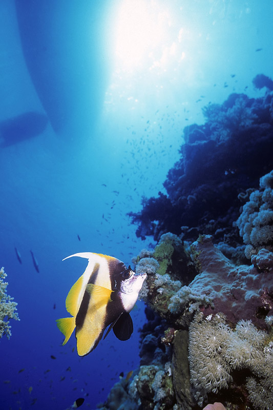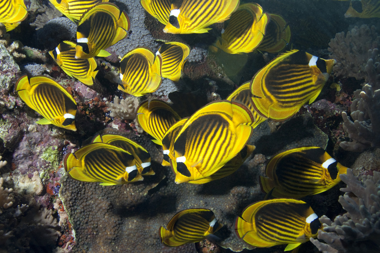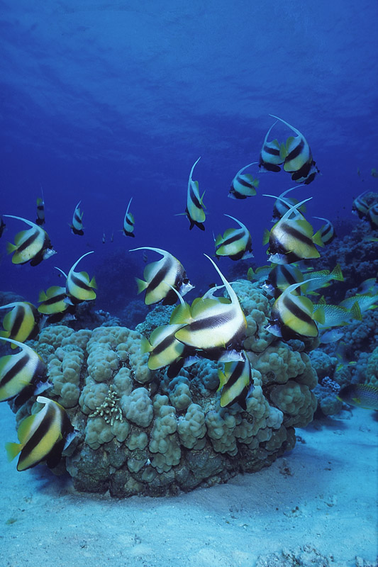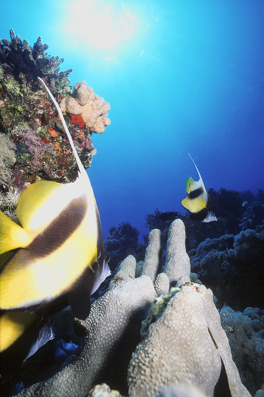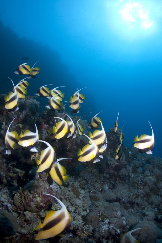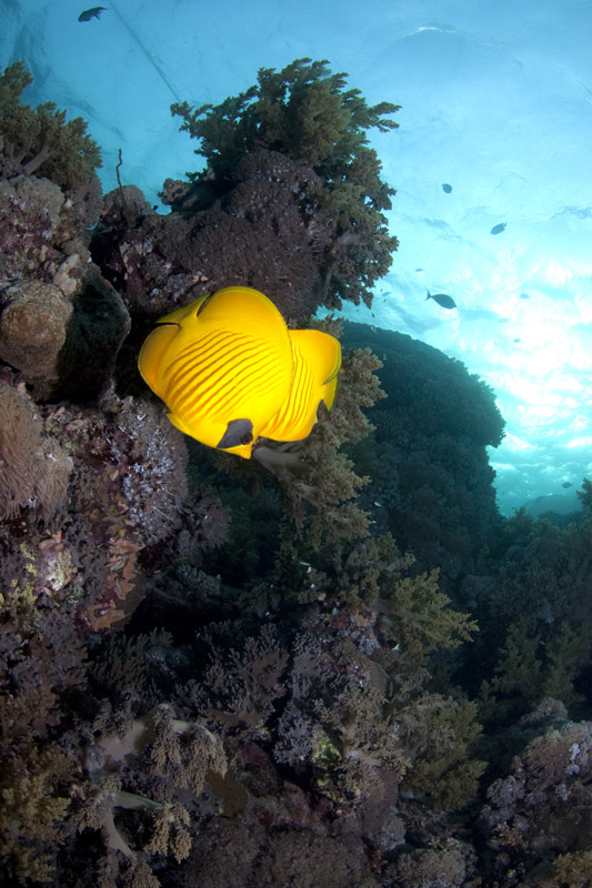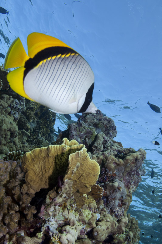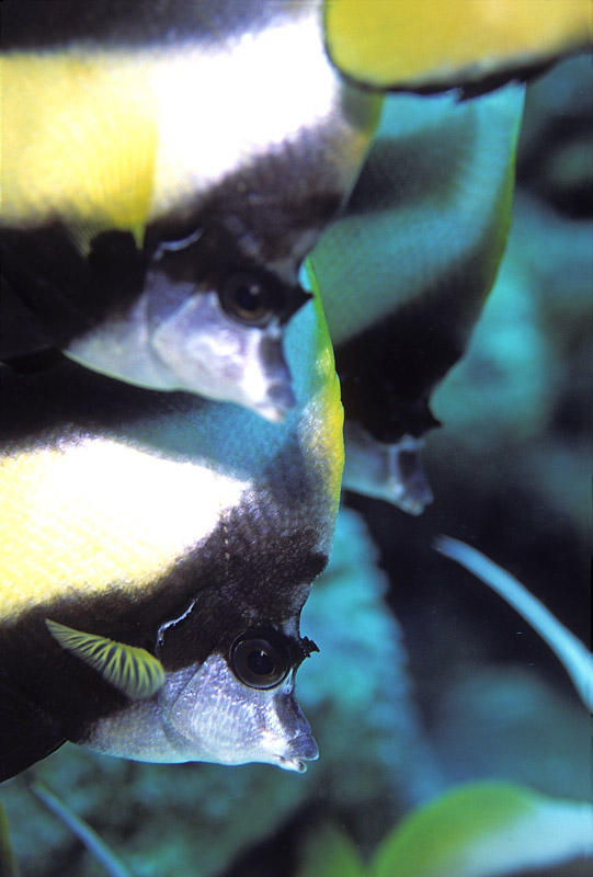 Considerata l'innumerevole quantità di pesci farfalla presenti, e considerato che ogni specie ha abitudini diverse possiamo solo parlarne in modo generico. Buona parte dei pesci farfalla, in particolare quelli più comuni denominati volgarmente con il nome di "pesci bandiera", hanno indole tranquilla, vivono su fondo sabbioso e sono perlopiù stanziali. Queste caratteristiche fanno si che diventi relativamente semplice fotografarli e soprattutto ci permetteranno di poter ambientare la nostra immagine in assoluta tranquillità. Il fatto di trovarsi in una condizione ideale non deve però diventare motivo di superficialità ma al contrario un ottimo esercizio per cercare di realizzare immagini che non siano scontate e banali. Il problema principale potrà arrivare dal fondo sabbioso che, se colpito dalla luce del flash creerà una enorme macchia di luce sparata. Quindi, non dimenticarsi mai di direzionare la luce del flash leggermente verso l'alto in modo da non colpire il fondo sabbioso. Se avrete la possibilità di appoggiarvi sul fondo sarà bene farlo con la massima cautela cercando di essere ben ancorati e concentrarvi esclusivamente sulla vostra immagine. I pesci farfalla vi offriranno diverse alternative: dall'immagine macro all'utilizzo di grandangolo. Starà a voi decidere che tipo di immagine volete realizzare e concentrarvi su quella soprattutto se disporrete di macchina ad ottica fissa. Sarebbe buona cosa quando si utilizza un grandangolo cercare di avvicinarsi il più possibile al soggetto o ancora meglio ai soggetti, visto che normalmente vivono in gruppo cercando di riprenderli senza tralasciare l'ambiente circostante e cercando di sfruttare la luce esterna. Come sempre il flash dovrà servire solo come luce di schiarita facendo attenzione a non creare forti ombre tra il pesce in primo piano e quello subito dietro.