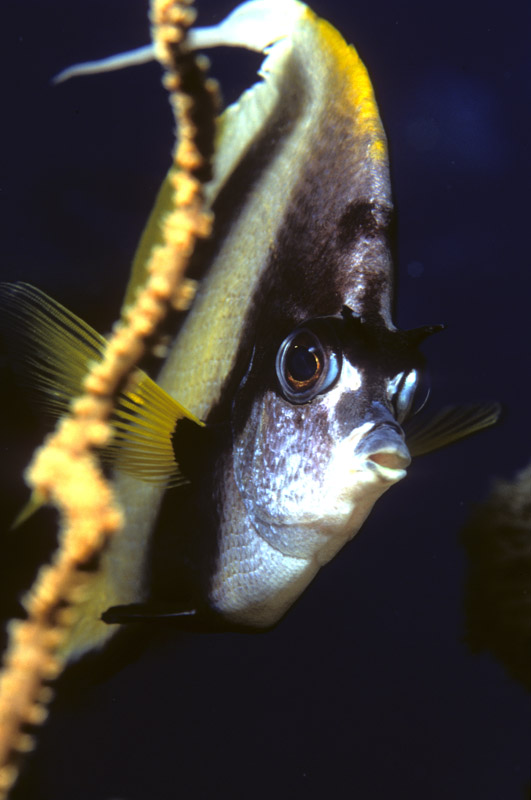 Il chaetodonte o citaredoSe volessimo trovare per Orfeo o per i grandi citaredi dell'antichità un attributo marino, dovremmo scegliere il chetodonte che ha suscitato negli antichi l'immagine di uno strumento musicale, come osserva Eliano: si dice che nel Mar Rosso viva un pesce dal corpo piatto come quello della sogliola. Le sue squame non sono molto ruvide al tatto; è dorato con strisce nere che partono dalla sommità del capo e giungono fino alla coda. Potremmo paragonarle alle corde tese di uno strumento musicale; ed è per questo motivo che lo si chiama citaredo. La sua bocca è compressa e nerissima inanellata in un cerchio color zafferano. Ha la testa variamente screziata di rilucenti oro e fregi neri. Le pinne sono dorate, la coda è di colore nero tranne all'estremità, che è di un bianco smagliante.I colori, che cambiano secondo gli esemplari, con la loro bellezza non possono non alludere alle musiche celestiali dei citaredi. Nelle Antille francesi si chiama demoiselles, signorine; anche gli spagnoli danno loro nomi femminili, come per esempio isabelita(testo tratto da Acquario di A. Cattabiani)
