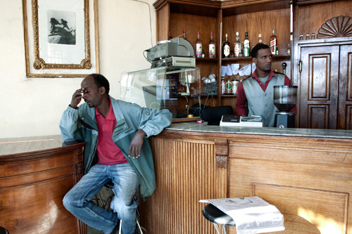 I bar di Asmara fanno parte della storia della luminosa città africana, dagli anni dei “vecchi coloniali” a oggi, alcuni sempre uguali in un tempo che pare sospeso. Sul viale principale, Harnet Street, i bar più frequentati, come lo storico bar Impero, hanno tavolini all’aperto, ci si siede, si beve il caffè, “l’espresso”, il tè o l’ottimo cappuccino, si gustano le brioche o le paste, e si guarda la gente che passa. In quello che era una volta il viale della Regina, un altro storico bar, il bar Vittoria, ha ancora i vecchi specchi, il vecchio bancone e le bottiglie con etichette d’epoca, un bar anni cinquanta frequentato anche dai pochi e stupiti viaggiatori che passano per Asmara. E’ difficile, nel tardo pomeriggio, trovare da sedersi, al bar Vittoria. Gli abituali frequentatori, quasi tutti eritrei, si danno appuntamento per fare molto più di due chiacchiere. Nel bar immerso in un’atmosfera felliniana, come molti altri bar di Asmara, si chiacchiera, si discute, si parla di calcio, si conoscono anche le squadre italiane. Ricordo un amico, il primo sindaco di Asmara dopo la liberazione dell’Eritrea. Era un uomo carismatico, aveva uno straordinario senso dell’humor, parlava sei o sette lingue, ed era un grande tifoso del Milan. Sapeva tutto sul calcio e ne parlava al bar con gli amici nei momenti in cui poteva distrarsi dai tanti problemi da affrontare, senza perdere di vista le partite del suo amato Milan.