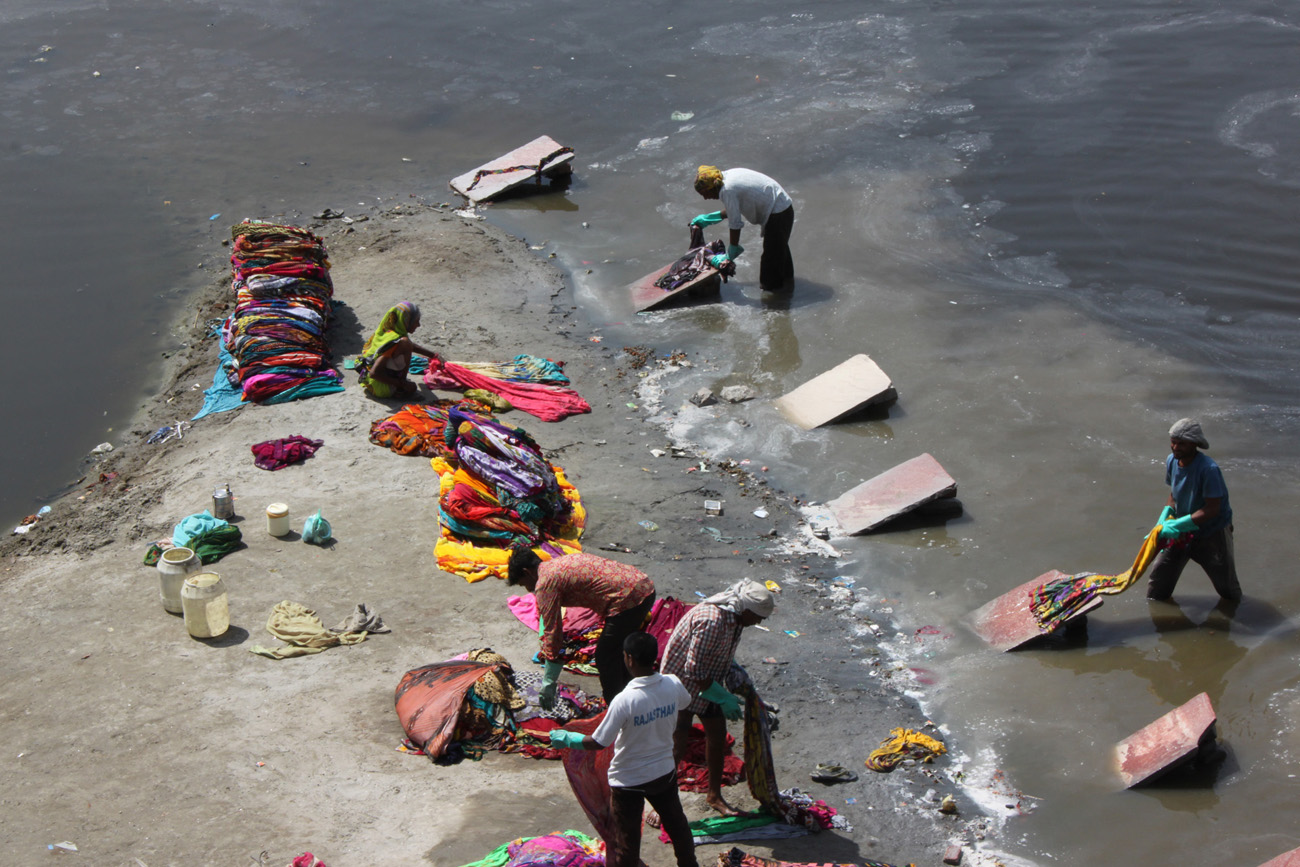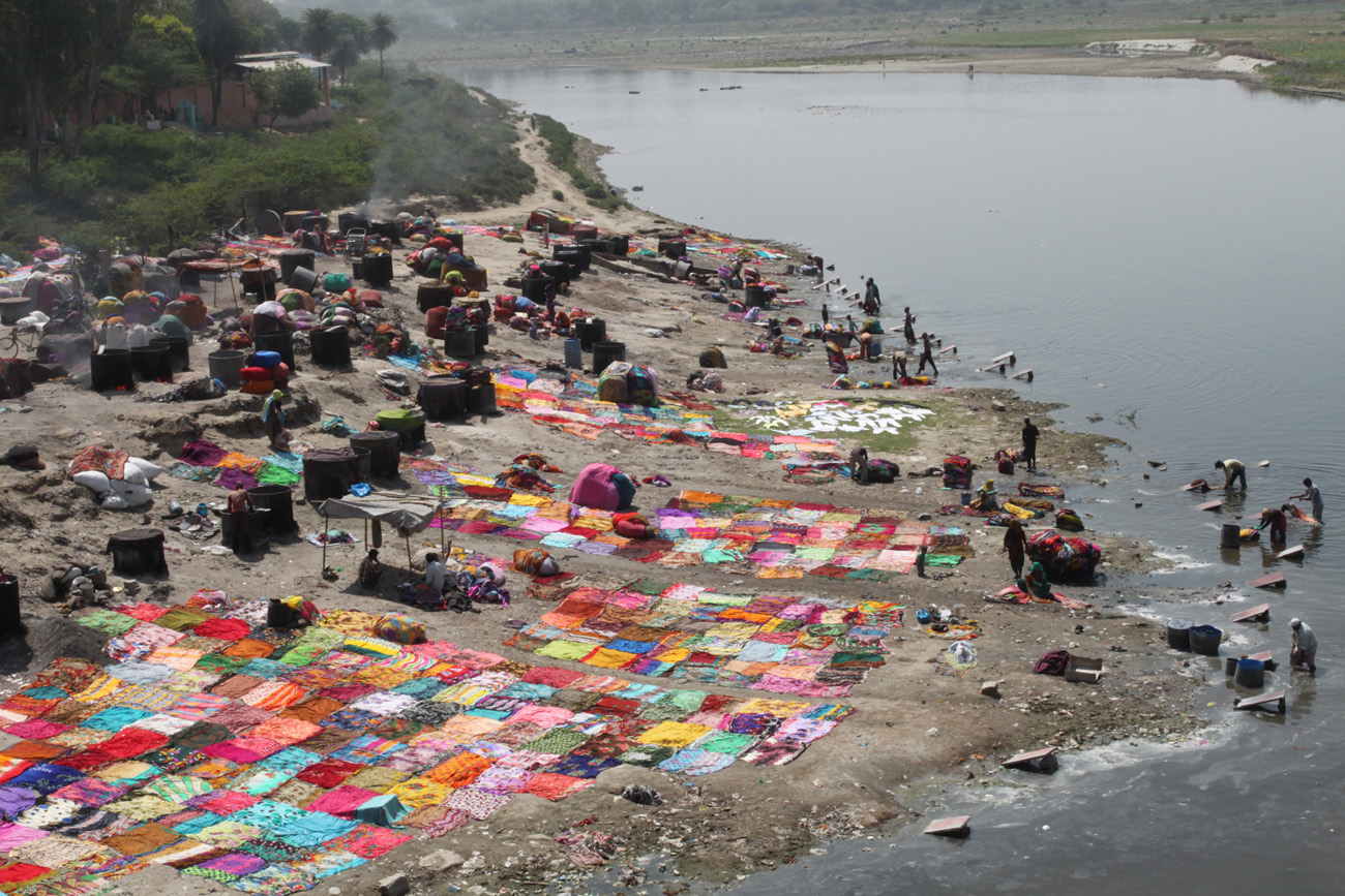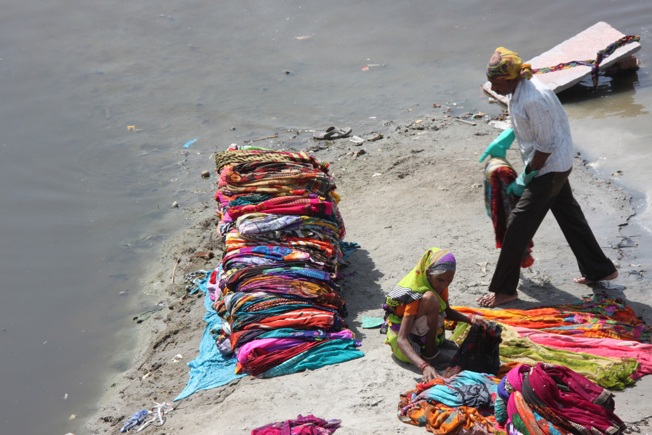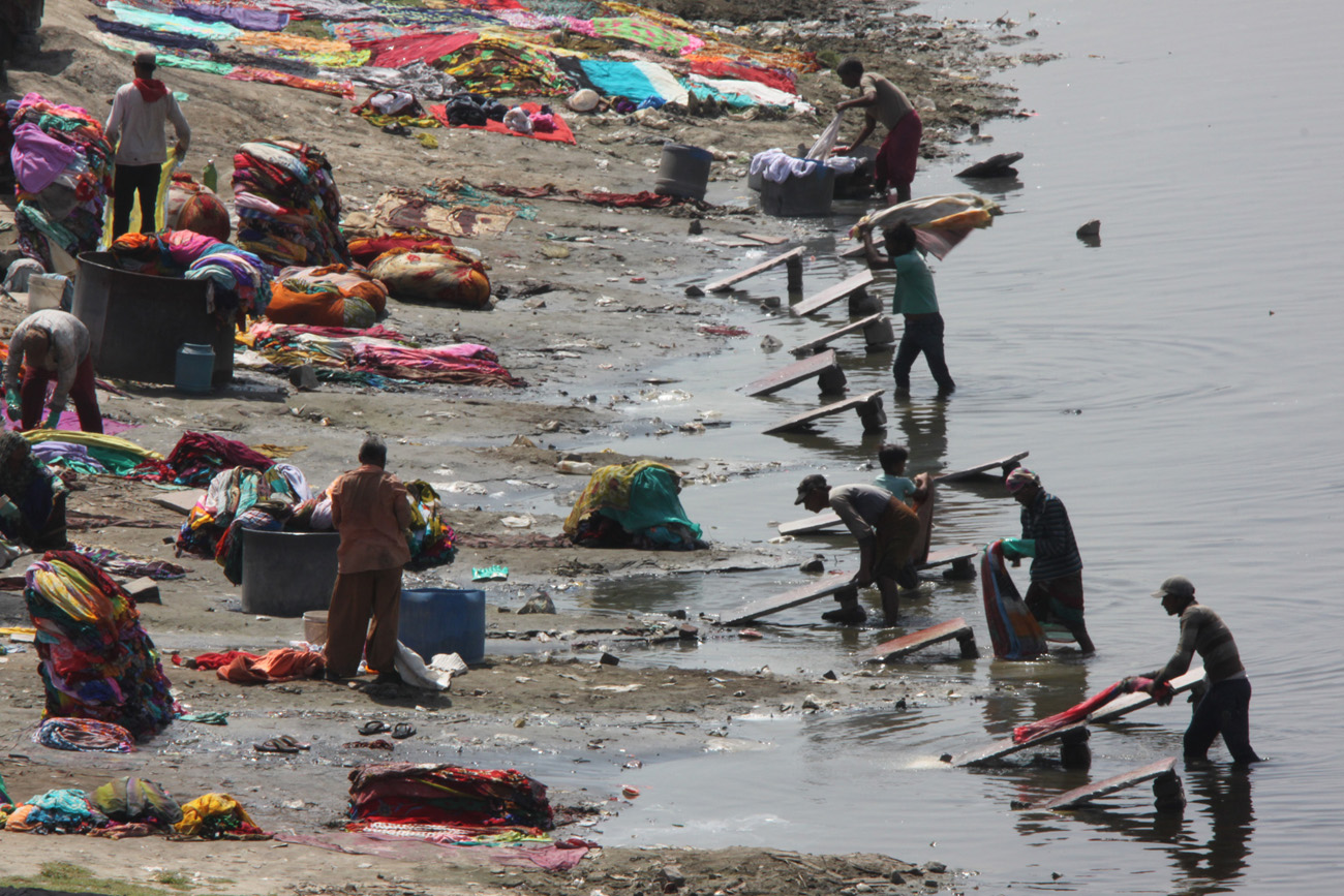Sotto uno squarcio di vita e colore: decine di persone lavano vestiti, sari e stoffe.