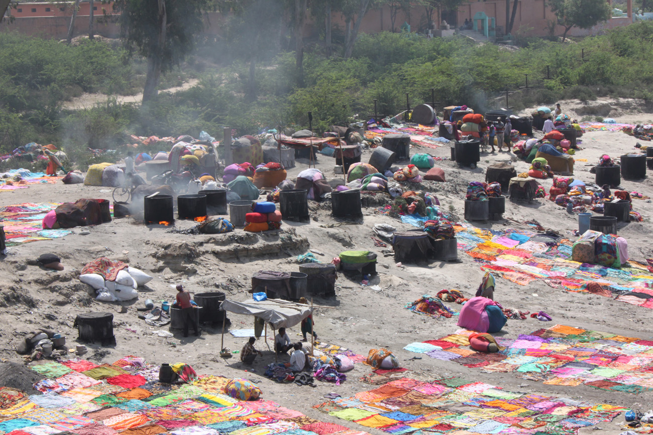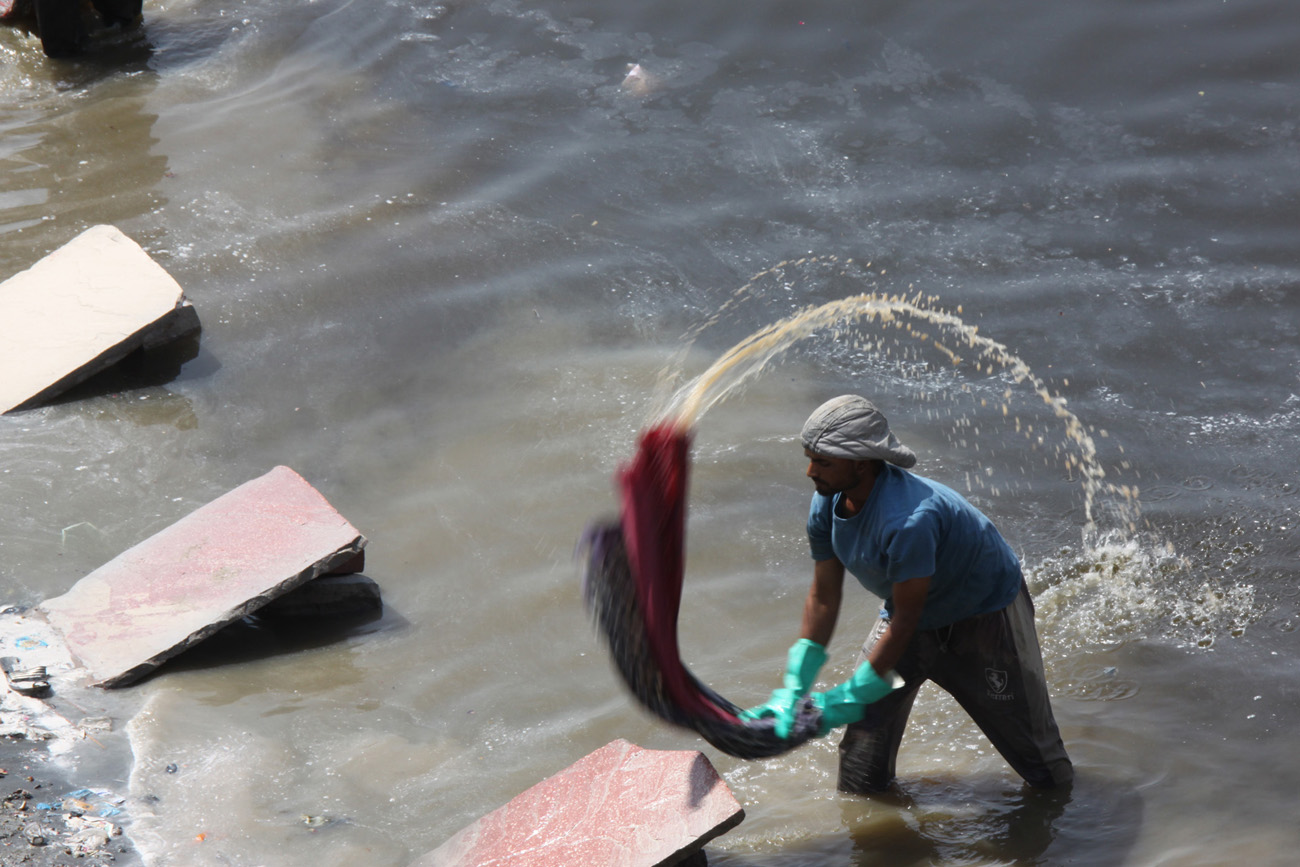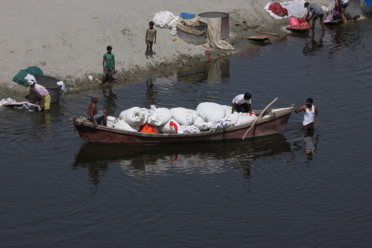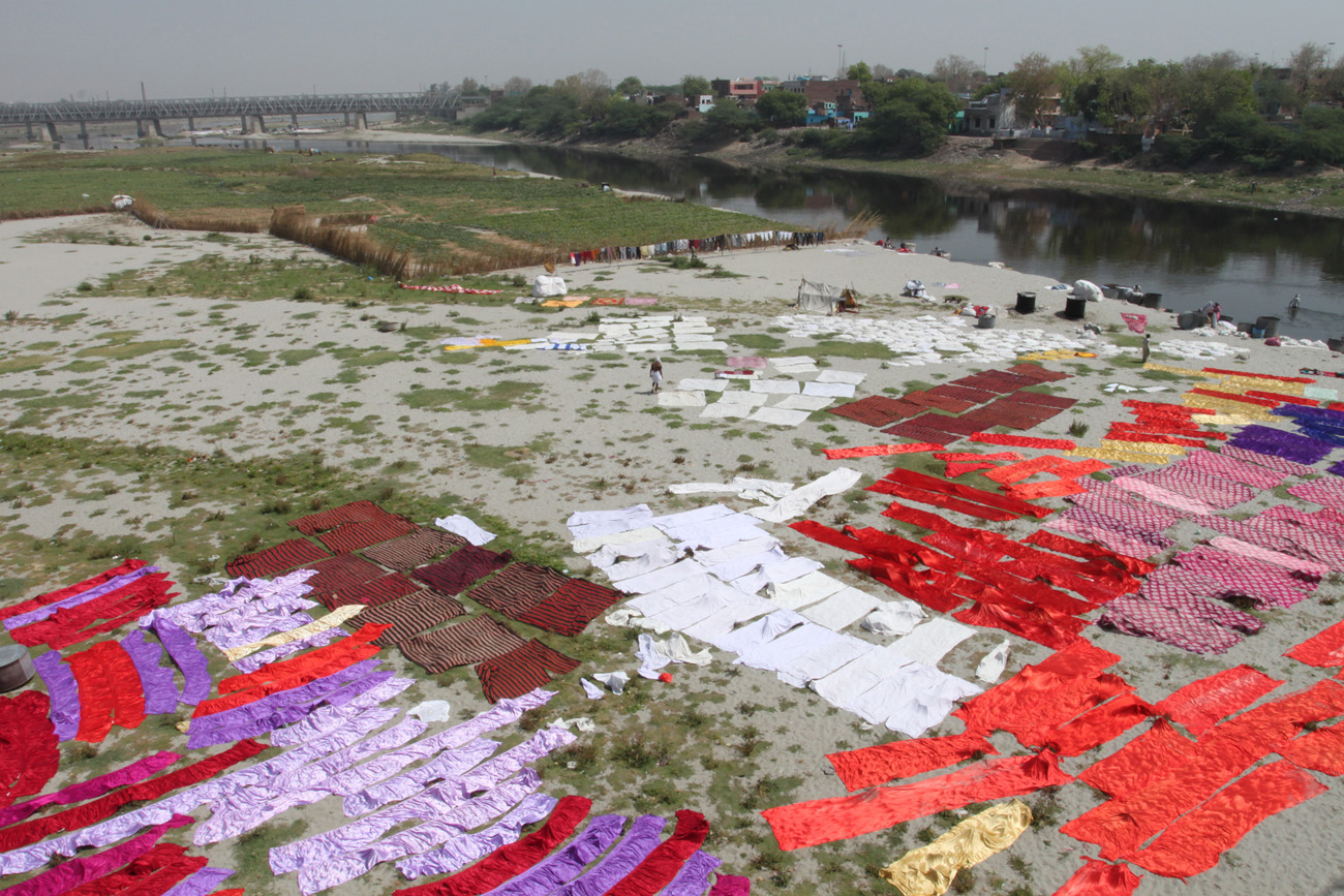 Sotto uno squarcio di vita e colore: decine di persone lavano vestiti, sari e stoffe.
