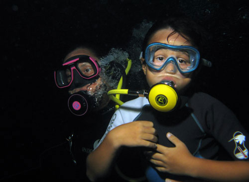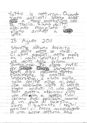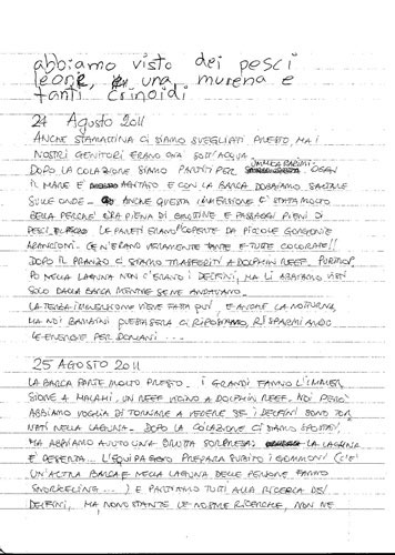 Stanotte abbiamo dormito sul ponte sotto le stelle. Ci siamo svegliati molto presto ma i nostri genitori erano già usciti dalla prima immersione. Poi siamo partititi per Dangerous Reef dove abbiamo fatto finalmente la nostra immersione. E' stata molto bella perchè oltre ai pesci che abbiamo visto di solito, siamo andati in una grotta. Nella grotta abbiamo visto una murena e appena fuori c'erano due bellissimi anemoni e un paio di balestra. Dopo il tramonto i nostri genitori ci hanno accompagnato in una breve notturna dove abbiamo visto del pesci leone, una murena e tanti crinoidi.
