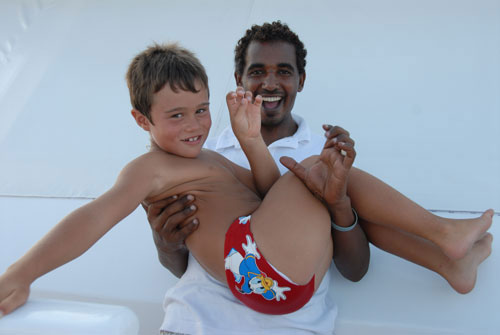 La barca parte molto presto. I grandi fanno l'immersione a Malahi, un reef vicino a Dolphin Reef. Noi però abbiamo voglia di tornare a vedere se i delfini sono tornati nella laguna. Dopo la colazione ci siamo spostati ma abbiamo avuto una brutta sorpresa, la laguna è deserta ... l'equipaggio prepara subito i gommoni (c'è un'altra barca, e nella laguna delle persone fanno snorkeling...) e partiamo tutti alla ricerca dei delfini, ma nonostante le nostre ricerche, non ne vediamo neppure uno. Sconsolati torniamo sulla barca, dobbiamo prendere una decisione: rimanere oppure proseguire l'itinerario? La guida Ahmed propone una votazione tra chi vuole rimanere e chi vuole fare l'immersione a sha'ab Claudio. Nonostante questo punto di immersione sia molto famoso, vince la voglia di rimanere. Ahmed e i ragazzi dei gommoni partono per un giro di controllo e ci chiamano perchè hanno visto i delfini. Saltiamo di nuovo tutti sui gommoni ma non tutti riusciamo a vederli, perchè il secondo gommone ha rischiato due volte di affondare perchè è rotto.