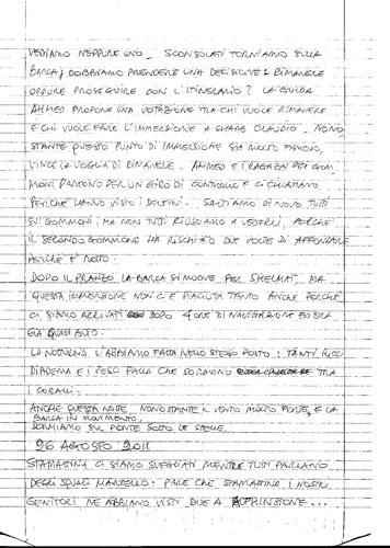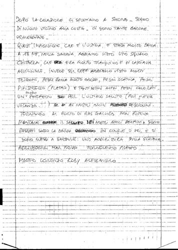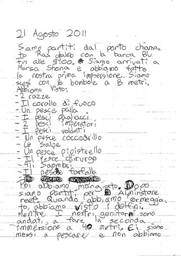 Siamo andati a fare snorkeling. Abbiamo visto un barracuda lungo un metro e mezzo. Dopo siamo andati a fare l'immersione e abbiamo visto una tartaruga. Poi quando siamo usciti dall'acqua sono passati tanti delfini sotto la barca. Dopo abbiamo mangiato e siamo partiti per il posto dove avremmo fatto la notturna. Quando siamo arrivati siamo andati a fare lo snorkeling con la torcia. Siamo usciti, abbiamo mangiato e siamo andati a letto.