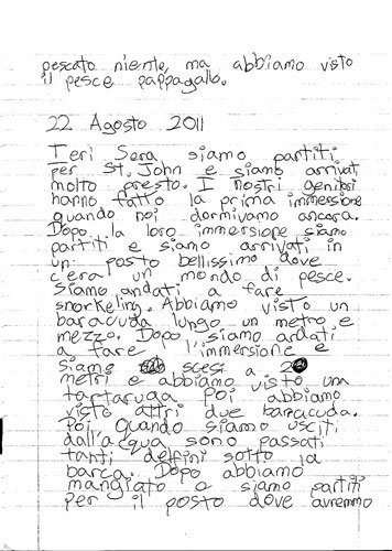 Ieri sera siamo partiti per St. John e siamo arrivati molto presto. I nostri genitori hanno fatto la prima immersione quando noi dormivamo ancora. Dopo la loro immersione siamo partiti e siamo arrivati in un posto bellissimo dove c'era un mondo di pesce.
