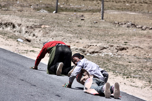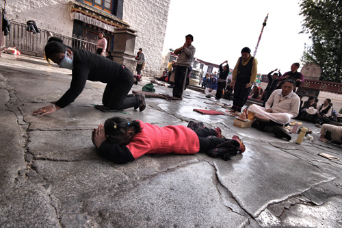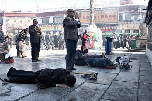 La città di Lhasa è stata occupata dai cinesi, una invasione non richiesta e tanto meno gradita dal popolo tibetano. Però la questione politica la tralascerei dando la libertà ad ognuno di trarre le proprie conclusioni, una cosa certa sulla quale posso garantire di persona, avendola vissuta direttamente riguarda la sicurezza del posto. In città si respira un’aria magica. Centinaia di pellegrini girano a piedi scalzi, rigorosamente in senso orario, intorno al tempio del Jokang, importante luogo di culto per tutti i buddisti del mondo. Eseguono le loro prostrazioni e le preghiere, in una atmosfera mistica e rilassata.