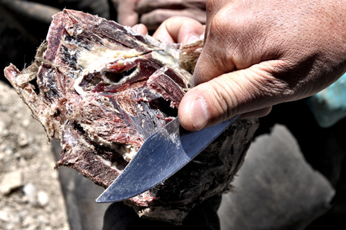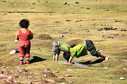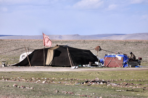 Lungo la strada bande di ragazzini nomadi si lavano nelle acque del fiume. Oggi è domenica, giorno di festa e di lavaggio. L'imponente ghiacciaio del Nien Tching Gang Sa ci fa da angelo custode, con i suoi mille crepacci e le nevi eterne con tutte le sfumature dal bianco al blu passando per gli azzurri. Un cielo blu pennellato di poche nuvole è l’unico tetto sulla testa del nomade Drogpa che incontriamo lungo la strada. Due yak e poche pecore, seduto al sole con un misero pranzo il Drogpa ci costringe a fermarci per offrirci la sua carne secca di yak. Accettiamo volentieri e scopro un sapore finissimo che mi ricorda il prosciutto di San Daniele o qualcosa di simile. Rimarrei con lui tutta la giornata, ma dobbiamo proseguire.