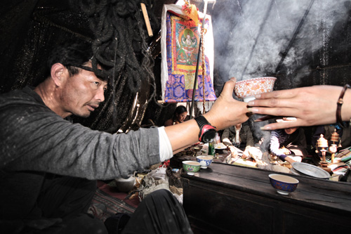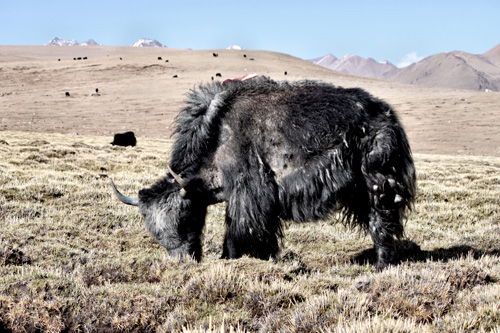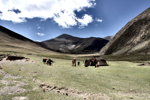 Arriviamo a Gyantse e visitiamo il suo Kumbum, un particolare monastero con pianta a spirale. Le decorazioni e le statue di Buddha e dei Protettori che si trovano all'interno sono magnifiche e in ottimo stato di conservazione. A Gyantse assaggio la tsampa, una farina d’orzo che i tibetani usano un po’ dappertutto. La farina è alla base di tutte le alimentazioni dei paesi poveri, in qualsiasi parte del parte mondo ci si trovi. Per il resto carne di yak, yogurt di yak, thè con burro di yak e poi ancora yak, yak e ancora yak. Il cibo comunque è saporito ma non eccessivamente speziato, è semplice ma con sapori più genuini della tipica cucina cinese del vicino Sichuan. Si usano anche vegetali che vengono coltivati in serra nelle poche vallate incastonate tra le montagne che sembrano dipinte grazie ai giochi di luce e ombra del sole e delle nuvole. Il tempo da queste parti può cambiare rapidamente. Il campo tendato ai piedi del Monte Chomokangar a 6.058 metri sembra un miraggio nel deserto, quando lo intravvediamo comparire e poi scomparire tra una curva e l’altra della strada che stiamo percorrendo. Un puntino disperso in un mare di verdi pascoli tra mandrie di yak, greggi di pecore e le curiose caprette tibetane che amano curiosare all’interno delle nostre tende ogni volta che transitano nelle vicinanze. Sono una gradita compagnia anche durante la nostra merenda pomeridiana preparata dentro la tenda ristorante dopo aver attraversato il Sugu-La a 5.300 metri di altitudine. Anche i nomadi delle tende vicine sono molto interessati alla nostra merenda, in particolare i bambini affabili e per nulla timidi, con i quali condividiamo volentieri il nostro cibo. Ricambiano la nostra ospitalità invitandoci nella loro tenda nera di pelo di yak e manco a dirlo indossano tipici abiti in pelo di yak. L’interno della tenda è caldo e accogliente, al centro si trova il focolare e tutta la famiglia seduta in cerchio che ci fa sentire ospiti graditi e rispettati.