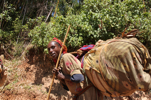 VITA DI STRADA E CULTURA DELLA FATICAL’Etiopia del Sud è universalmente nota per essere stata la culla dell’umanità. Qui il genere umano ha mosso i suoi primi ed incerti passi. Qui sono nati la preistoria, la storia del mondo prima e anche quella dell’uomo poi.Esistono popolazioni al confine con il Kenya, nella zona del lago Turkana, che fino a 30 anni fa erano a noi sconosciute così come noi eravamo per loro perfetti sconosciuti. Poi abbiamo invaso i loro territori, abbiamo preteso “un posto al sole”, come se la loro casa fosse anche la nostra, come se tutto fosse dovuto. Abbiamo fornito armi e medicine, convinti che avessero bisogno di entrambe. Abbiamo preteso di insegnare cose che conoscevano meglio di noi. Gli stessi generali italiani inviati da Crispi e Vittorio Emanuele li descrivevano così: “questi indigeni sono scaltri e ospitali, fanno domande intelligenti e danno risposte ancor più furbe”.Già da queste parole avremmo dovuto capire che sarebbe stato meglio invertire la marcia e tornare a casa. Ma la storia ha invece fatto il suo corso.La gente vive in strada e vive la strada, vive la natura immersa nella natura. L’africano ha modellato se stesso per inserirsi al meglio nell’ambiente che lo circonda, per vivere al ritmo della natura, il tempo della luce e del buio. Anche l’ora in Etiopia è diversa, le sei della mattina sono l’ora zero, l’inizio della giornata, non la mezzanotte come per noi. Il tempo dell’alba e quello del tramonto. Nessuno ha orologi al polso, l’orologio è biologico.Una donna etiope che deve raggiungere il pozzo per prendere l’acqua non si domanderà mai quanto tempo ci vuole. Ci va e basta. Sotto il sole, a piedi nudi, per molti chilometri con in spalla il prezioso carico. Anche qui, sono le donne a fare il lavoro sporco. Enormi fascine di legna, sacchi di patate, giare di acqua, sembrano muoversi da soli sul ciglio della strada. Sotto questi carichi si intravede a malapena la sagoma minuta, stanca e piegata di una donna o di una mamma, spesso anche di una bambina.