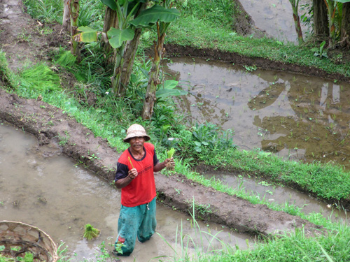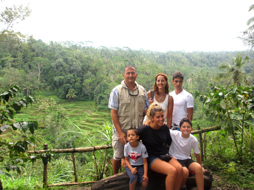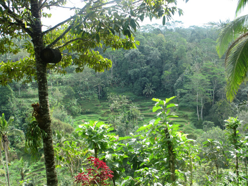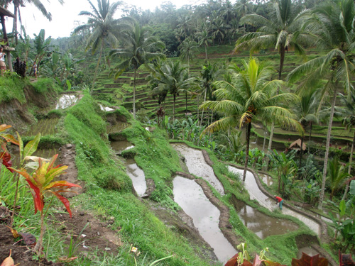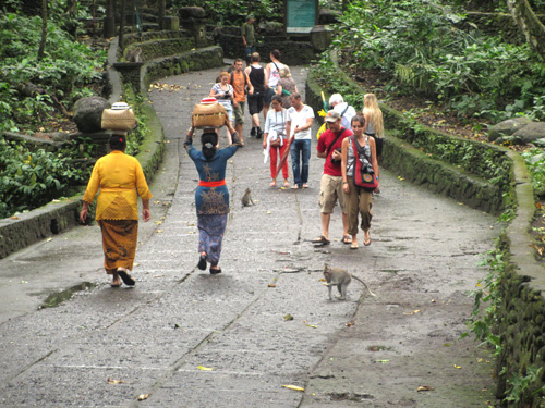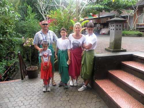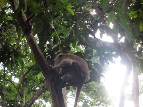 A seguire un tour in una splendida risaia a terrazze dove Luc ha giocato a fare il pirata nascosto e Rosanna “grande” da perfetta bond girl, è cascata nell’acqua della risaia! Rosanna “piccola” ha immortalato i nostri piedi completamente infangati.Arrivati, dopo oltre tre ore di traffic jam balinese con guida a destra, nella zona del vulcano, non abbiamo visto assolutamente nulla causa nebbia intensa.Sulla via del ritorno, attraversata faticosamente Ubut, la famosa città degli artisti, che ci è apparsa fortemente commercializzata, ci fermiamo nella vicina foresta delle scimmie sacre: abbiamo lasciato in auto orologi, occhiali, portafogli ecc. perché pare che le scimmie rubino di tutto.