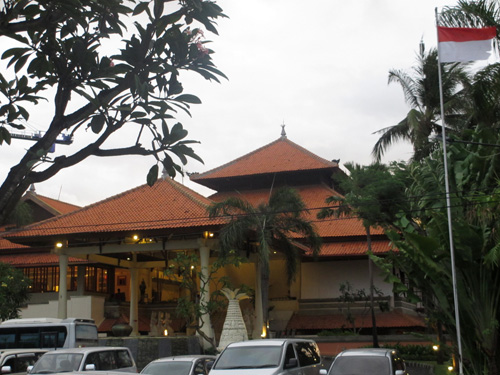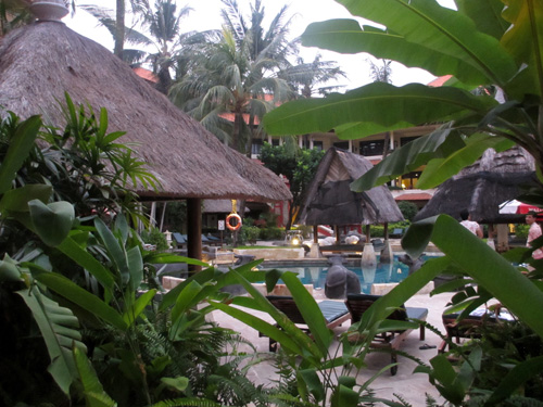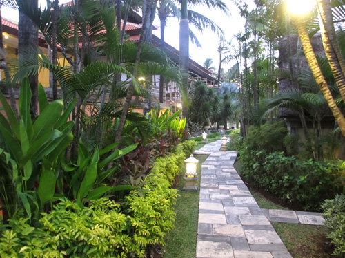 – e alloggiamo in un albergo di charme sul mare (anche se un po’ su con l’età ed infatti era in parziale ristrutturazione con i ponteggi in bamboo!), comunque molto bello soprattutto per il lussureggiante giardino tropicale impreziosito da piscine e corsi d’acqua