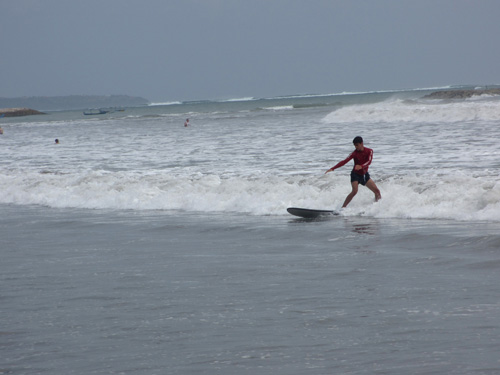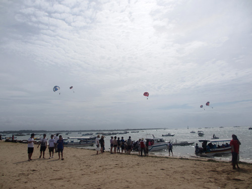 La sveglia suona alle sette ma non la sente nessuno; alle 8,45 ci svegliamo di soprassalto ricordandoci che l’autista ci aspetta alle 9. Non ce la faremo mai! Alle 9 in punto l’autista ci telefona in camera, Vito risponde con voce registrata, un po’ inglese un po’ tedesco: .Questa volta la gita è meno impegnativa del giorno precedente.Prima tappa a pochi metri dall’Hotel, sulla spiaggia attrezzata per water sports di Nusa Dua: moto d’acqua, bananaboat, parasailing, flyingboat ecc.; contrattiamo due attività per ognuno dei 4 figli, ci dicono 15 minuti per attività, totale 120 minuti a 200 euro; in realtà si va' dai due ai tre minuti! Il tutto su una spiaggia iperaffollata di teenagers cinesi, una vera bolgia. Proseguiamo per la celebre Kuta beach, paradiso dei surfisiti nonchè la spiaggia alla moda di Bali. Un traffico indicibile, centinaia di boutiques e alberghi, un mix di Rimini, Sharm e Miami dalle parti di Ocean Drive. Ma esiste un luogo silenzioso e senza folla a Bali? Luc (col suo fisico d’acciaio e la riconosciuta abilità per tutti gli sport su tavola, dallo snowboard allo skateboard) si dedica ad una ora di surf, tampinato dai fratelli minori e da Rosanna “piccola” che lo immortala in pose degne di “Un Mercoledì da leoni”; restando in tema Rosannina, sulle orme di John Milius, non disdegna di fotografare anche un anonimo surfista biondo “californiano” super palestrato; Rosanna “grande” prende il primo sole vero dall’inizio dell’estate e, da vera bond girl, si addormenta sulla spiaggia per sfuggire alla folla di venditori ambulanti.