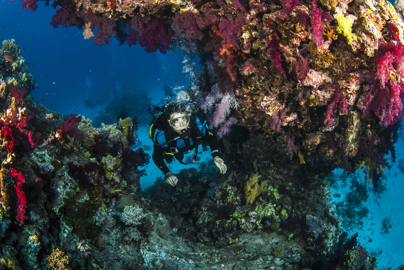 Infine c’è Elphinstone Reef, dalla caratteristica sagoma stretta ed allungata che si estende da nord a sud per circa 600 metri. E’ uno dei siti di immersione più famosi al mondo, grazie alla ricchezza indescrivibile delle sue barriere, ornate da grandi gorgonie, alcionari di ogni colore e dimensione, corallo nero, madrepore sapientemente modellate da madre natura. La sua fama è dovuta anche alla presenza di molto pesce pelagico, come squali martello, Longimanus, tonni, squali grigi, barracuda, carangidi e soprattutto per la presenza di un enorme arco naturale, alto otto metri per sei di larghezza e posto alla profondità di circa 60 metri che unisce le pareti est e ovest del reef.