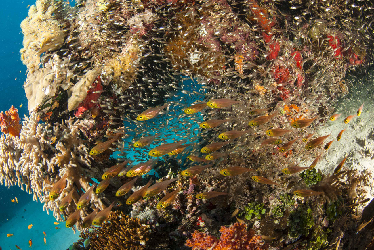 Il mattino successivo lasciamo Porto Galeb e andiamo ad ormeggiare a Marsa Trombi distante una mezzora di navigazione. Si scende per la check dive su una distesa sabbiosa, intervallata da blocchi corallini frequentati da diverso pesce di barriera e tante formazioni madreporiche, con una massiccia presenza di corallo di fuoco. L’esplorazione culmina su un agglomerato roccioso interamente ricoperto da alcionari e avvolto da una nuvola di glassfish sempre molto coreografici, ai quali dedico qualche scatto fotografico. Nel primo pomeriggio ripetiamo l’immersione che si rivela ancora più interessante della precedente, grazie a una maggiore presenza di pesce: fucilieri, platax, cernie, pesci palla, pterois volitans, razze e altra minutaglia in un vorticoso andirivieni fra pertugi e grotticelle. Dopo il rientro in barca si parte per le Brother’s. Ci attendono circa otto ore di navigazione e il tragitto è contraddistinto da mare mosso che crea un certo disagio agli ospiti e a qualche membro dell’equipaggio.