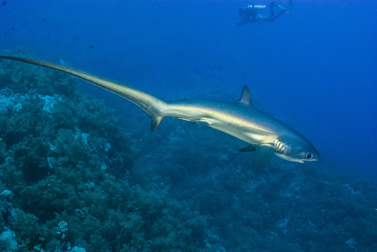 Rientrati a bordo decidiamo di ripetere l’immersione dando ascolto ai consigli delle guide, che in queste zone il Volpe lo hanno avvistato più volte. Puntualmente alle 10.30 siamo pronti per il tuffo diretto dalla barca, dirigendoci su un pianoro contraddistinto da due panettoni di roccia che precipitano nel blu. Appena raggiunto il fondo a -25mt, notiamo un insolito movimento di pinnuti e, inaspettatamente da lì a poco quattro Longimanus iniziano un carosello di accerchiamento e avvicinamento. L’interesse viene improvvisamente assorbito dall’inconfondibile silhouette di uno squalo volpe, che giunge da lontano ma dopo qualche giro furtivo si dilegua nel blu. Non è finita poiché dopo pochi secondi ecco spuntarne un altro ancora più grande e persino curioso. Ci gira intorno per alcuni minuti, regalandoci momenti indimenticabili intrisi di emozione, dal momento che osservarlo così da vicino rappresenta un’occasione davvero straordinaria. Conoscendo la sua indole timida, respiro lentamente per non disturbarlo e seminascosto sul fondo lo osservo attentamente.