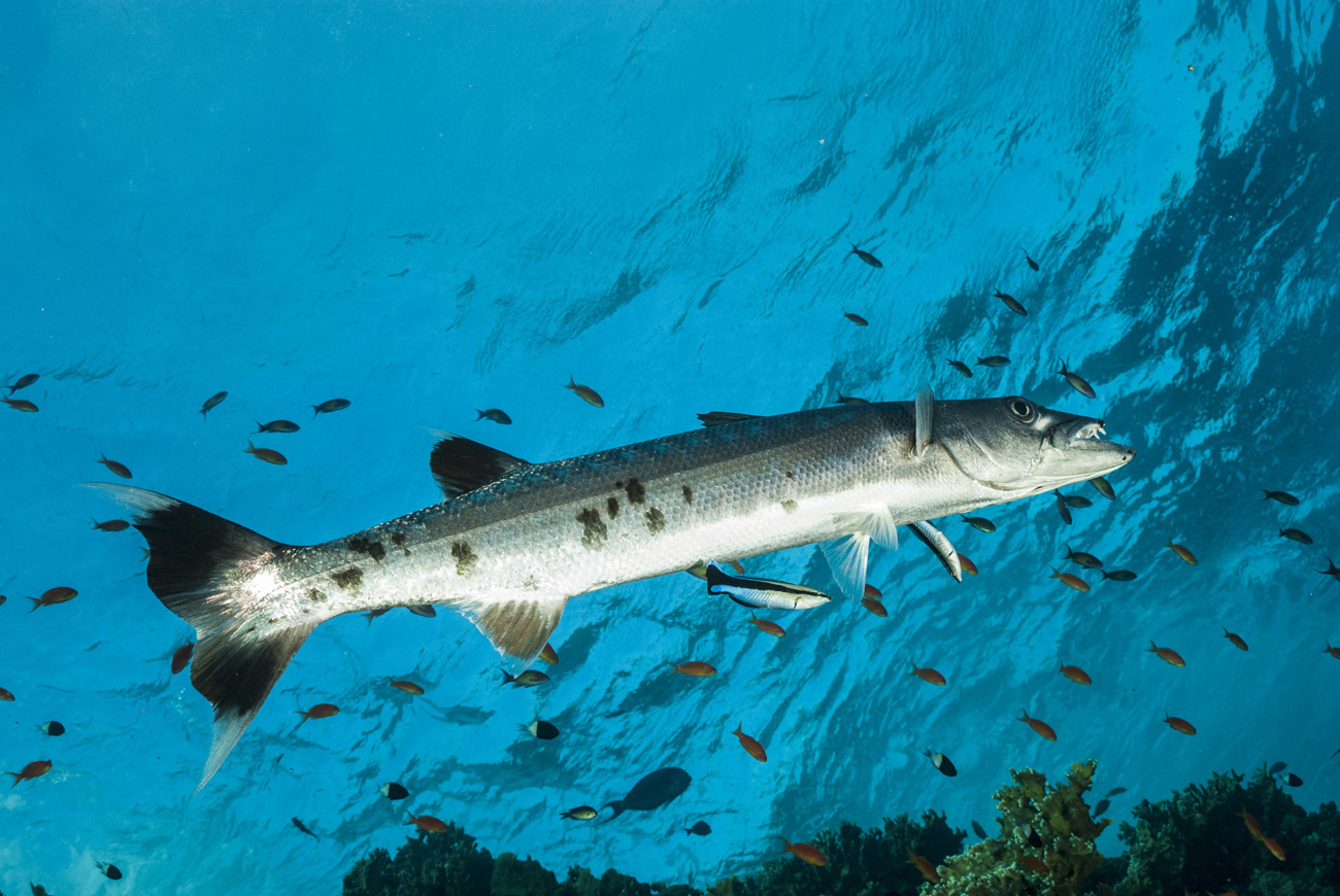 In compenso, tre Longimanus si sono materializzati dal blu, con accerchiamenti progressivi sempre più vicini, mentre sullo sfondo fanno bella mostra di sè grossi tonni che sfrecciano come siluri, numerosi carangidi e barracuda e qualche timido napoleone che si mantiene distante. Risalendo di quota incontriamo un bell’esemplare di barracuda intento alle pulizie di rito in una cleaning station, per nulla infastidito dalla mia presenza e da quella di altri sub.