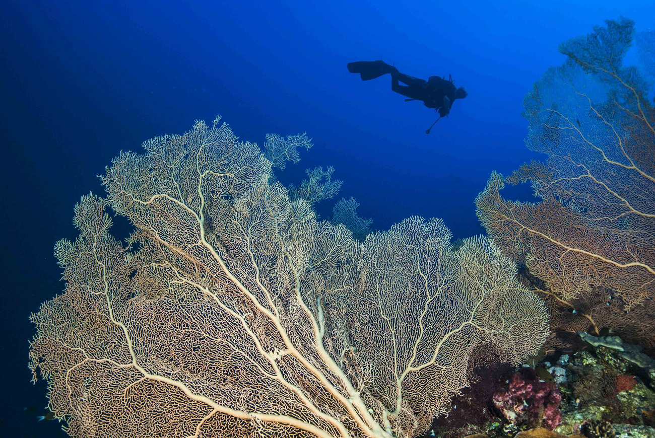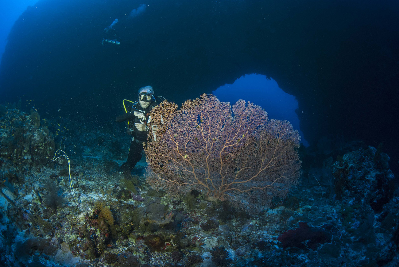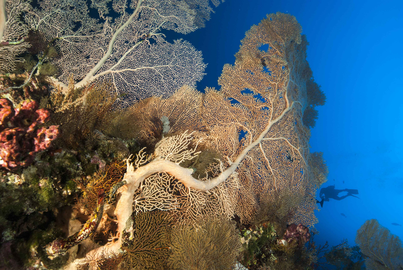 Come da programma ripeteremo la seconda e terza immersione a Small Brother, puntando su altri versanti dell’isolotto. Di norma la prima discesa è sempre più profonda per la ricerca di pesce pelagico che però non si fa vedere, quindi si inizia lentamente la risalita per l’esplorazione delle pareti alle quali sono arroccate gorgonie gigantesche che si intravedono fino a profondità più impegnative, e non posso non pensare a quale meraviglia si assisterebbe raggiungendo quelle batimetriche. Hanno tronchi così grossi da assomigliare più ad alberi terrestri e ventagli così ampi che neppure il fisheye montato sulla reflex riesce a coprire. Risalendo scorgo un pterois volitans o pesce Leone immobile con le pinne dorsali e ventrali estroflesse e protese nel blu, così approfitto del modello per portarmi a casa qualche scatto interessante.