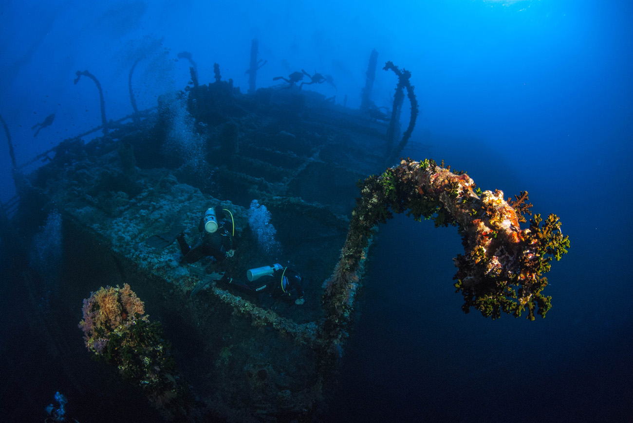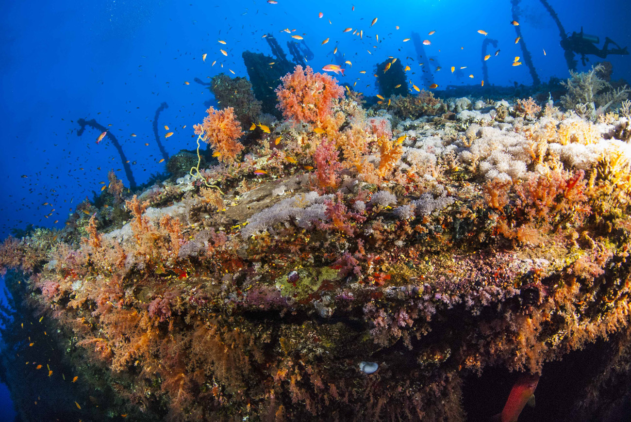 Considero questa immersione una delle più belle del Mar Rosso, grazie ad una impressionante vegetazione che nel corso dei decenni ha preso il sopravvento sull’intero bastimento. Per ovvi motivi di sicurezza limitiamo la discesa a una profondità di -40 metri, da dove si gode una visione mozzafiato, con la sagoma del relitto che si staglia nettamente verso la superificie e visibile per tutta la sua lunghezza grazie alla trasparenza eccezionale di queste acque uniche al mondo. Ovunque è un tripudio di colore, con alghe, spugne coralli molli e duri che ricoprono ogni parte delle strutture. Nella stiva centrale intravvedo una grossa cernia ma è troppo fonda e distante, pertanto proseguo la perlustrazione volgendo di tanto in tanto lo sguardo verso il blu, dove non è raro avvistare grosso pesce di passo. Anche se considerabili eccezionali, gli incontri con lo squalo balena e i grandi pesci luna sono sempre possibili mentre lo squalo volpe, seppure molto schivo, è invece stanziale.