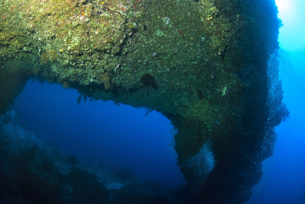 Nonostante esista ampia letteratura su questo fantastico sito di immersioni, non è sufficiente per descrivere le meraviglie sommerse celate fra le sue pareti che, da nord a sud, precipitano nel blu più profondo. Si scende a punta Nord a favore di una forte corrente che ci sospinge lungo un pianoro che da -12 metri digrada fino a -45, incontrando foreste di gorgonie, coralli di ogni tipo e alcionari multicolori. Un’occhiata ai dintorni è di rigore, e all’orizzonte ecco materializzarsi un paio di squali grigi sospettosi e un gruppo di carangidi; poi l’inesorabile computer ci riporta all’ordine imponendo la risalita.