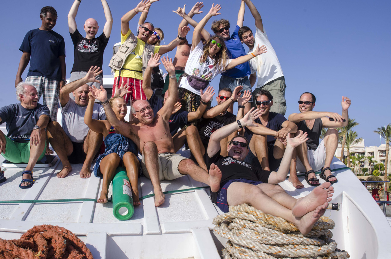 Verso le cinque, a bufera placata e col vento in netta diminuzione, ringraziamo tutti i membri dell’equipaggio che hanno dato il massimo e torniamo nelle nostre cabine. Ci rimangono un paio d’ore di riposo e altre due immersioni nella parete sud di Daedalus, concluse con grande soddisfazione per via di ulteriori incontri ravvicinati con una manta e coi ‘Signori del Mare’.