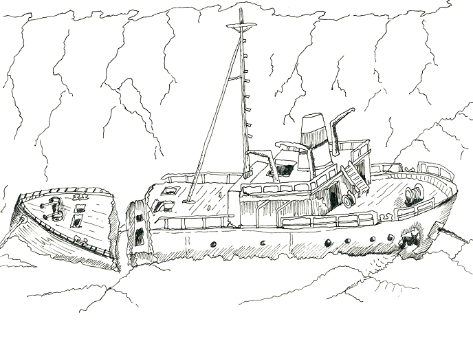 Cargo di nazionalità russa affondato a metà degli anni settanta all’interno della laguna sud est dell’isola di Zabargad. Per anni il solo indizio che lasciava presupporre la presenza di un relitto erano le tre scialuppe di salvataggio arenate e rinvenute nelle insenature poste a nord est e a sud ovest dell’isola; non si trattava di rottami spinti dal mare ma di imbarcazioni in allumino di tipo inglese lunghe circa 7 metri e dotate di pompe di sentina manuali. Durante una ventosa giornata di settembre 1996, con le onde che si formavano all’interno della laguna, a tratti affiorava dalla schiuma un moncone ferroso, qualcosa di indefinibile ma che non aveva niente a che fare con l’ambiente del reef, un piccolo pezzo metallico che compariva e scompariva seguendo il flusso delle onde. Da lì al ritrovamento passarono pochi minuti e davanti agli occhi la sagoma del piccolo cargo adagiato sul fondo in perfetto assetto di navigazione con la prua rivolta verso il mare aperto. La prima sensazione osservando il relitto lascia supporre che si trovasse all’interno della piccola laguna in cerca di un ridosso e questo poteva verificarsi soltanto a causa di una avaria. Ipotesi successivamente avvalorata da una serie di particolari determinanti: la poppa apparve devastata da una enorme falla con le lamiere contorte che si aprono verso l’esterno, le gruette cala scialuppe disarmate, anche queste orientate verso l’esterno ed infine le catene delle ancore calate dalle cubie nel tentativo estremo di bloccare la nave nell’unico punto ridossato. Questi i dettagli che avvalorano l’ipotesi di un incidente a bordo che causava una avaria irreversibile ed infine l’affondamento. Soltanto da questi primi fotogrammi si intuiva il disperato tentativo di salvare la nave da parte del comandante e del suo equipaggio per poi arrendersi alla forza devastante di un mare in burrasca e di un reef che non lascia scampo, prima di lasciare che i flutti si rinchiudessero per sempre sullo scafo.