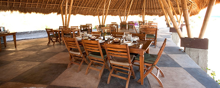 Il Sunset Restaurant permette di gustare piatti della cucina italiana e indonesiana. Il Ristorante è il centro della vita del Resort, un fantastico spazio totalmente aperto sui quattro lati in modo da ricevere la leggera brezza marina, coperto da un caratteristico tetto di bambù dalle forme ondulate dal quale scendono luci e ventole a pale. Di fronte al ristorante il caratteristico molo in legno, punto di ormeggio delle imbarcazioni. E' qui che si consuma buona parte della semplice vita sociale tra gli abitanti del Komodo Resort. E' qui che si incontreranno Stefano, Antonello e tutto lo staff del Komodo per scambiare quattro chiacchiere ed ascoltare dalla loro voce i racconti di questo luogo fuori dal tempo.