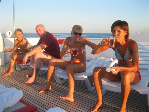 Già, perché la crociera sull’Aldebaran non si limita alle bellezze sottomarine. La magia del sole all’alba che, nascendo all’orizzonte, accompagna la nostra prima colazione nel solarium all’attico. Le onde che si infrangono sul reef e colori che dal blu profondo passano alla trasparenza invogliando un giro di snorkeling o un tuffo dall’alto della barca. Le giornate scandite dal ritmo del sole scivolano via, il tramonto ci offre un ulteriore spettacolo con una luna rossa trionfante nel cielo, mai vista prima. L’equipaggio a prua festeggia la fine del digiuno del Ramadan con frullati di datteri e melone, mentre noi auguriamo il più sincero buon appetito.