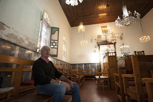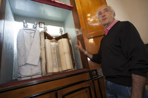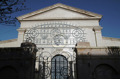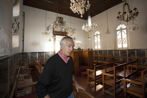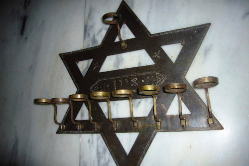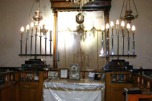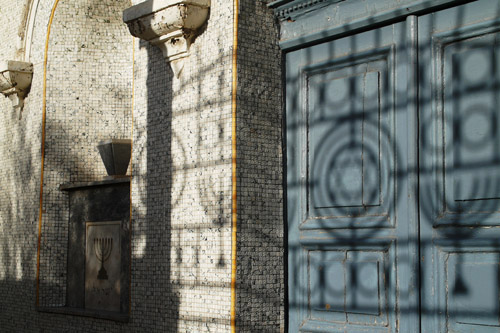 La Sinagoga rimane invece laterale alla stradina più stretta, protetta da una cancellata in ferro battuto decorata con motivi d’ispirazione religiosa ebraica. Il contrasto tra la cancellata scura, la facciata rivestita da piccole tessere di mosaico chiare e il cielo limpidissimo, indaco, è semplicemente meraviglioso. Mentre scatto fotografie, sento dietro di noi una persona. Si avvicina e ci rivolge la parola. Si presenta così il rabbino Cohen, che, fortuna vuole, passa proprio in quel momento. Ci chiede da dove veniamo. Curioso e gentilissimo ci invita ad entrare. Apre e richiude il cancello con una catena e lucchetto alle nostre spalle. Ci illustra dapprima l’esterno e comincia a spiegare quando è stata costruita la Sinagoga, nel 1905. La facciata simmetrica ha un rosone centrale e due nicchie laterali, in una vi è raffigurata la Menorah, il candelabro ebraico a sette braccia e nell’altra la Torah, la tavola della legge ebraica. Ci fa entrare all’interno passando dalla porta laterale (il portone principale sotto al rosone è aperto solo per le funzioni ufficiali) passando da un piccolo vano pieno di libri e testi sacri. Offre e chiede ai nostri accompagnatori maschi di indossare il kippah, il tradizionale copricapo usato dagli osservanti ebrei maschi all’interno dei luoghi di culto. Continua ad accendere luci per farci vedere e fotografare meglio. E’ pieno di lampadari, di diverse fatture e provenienze.
