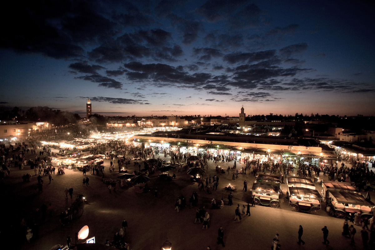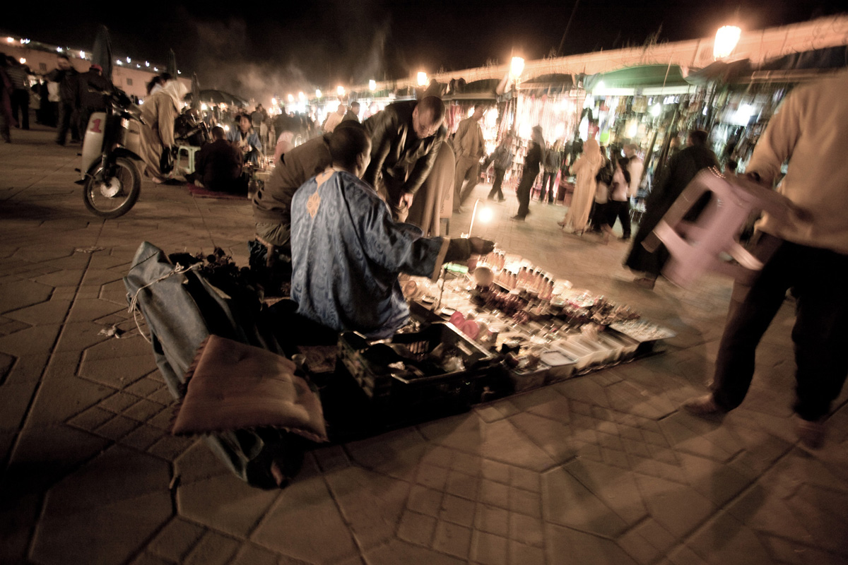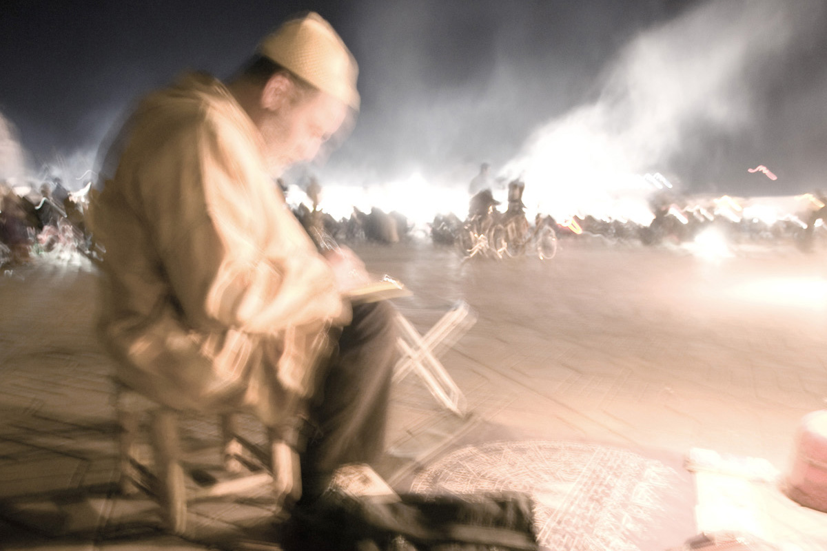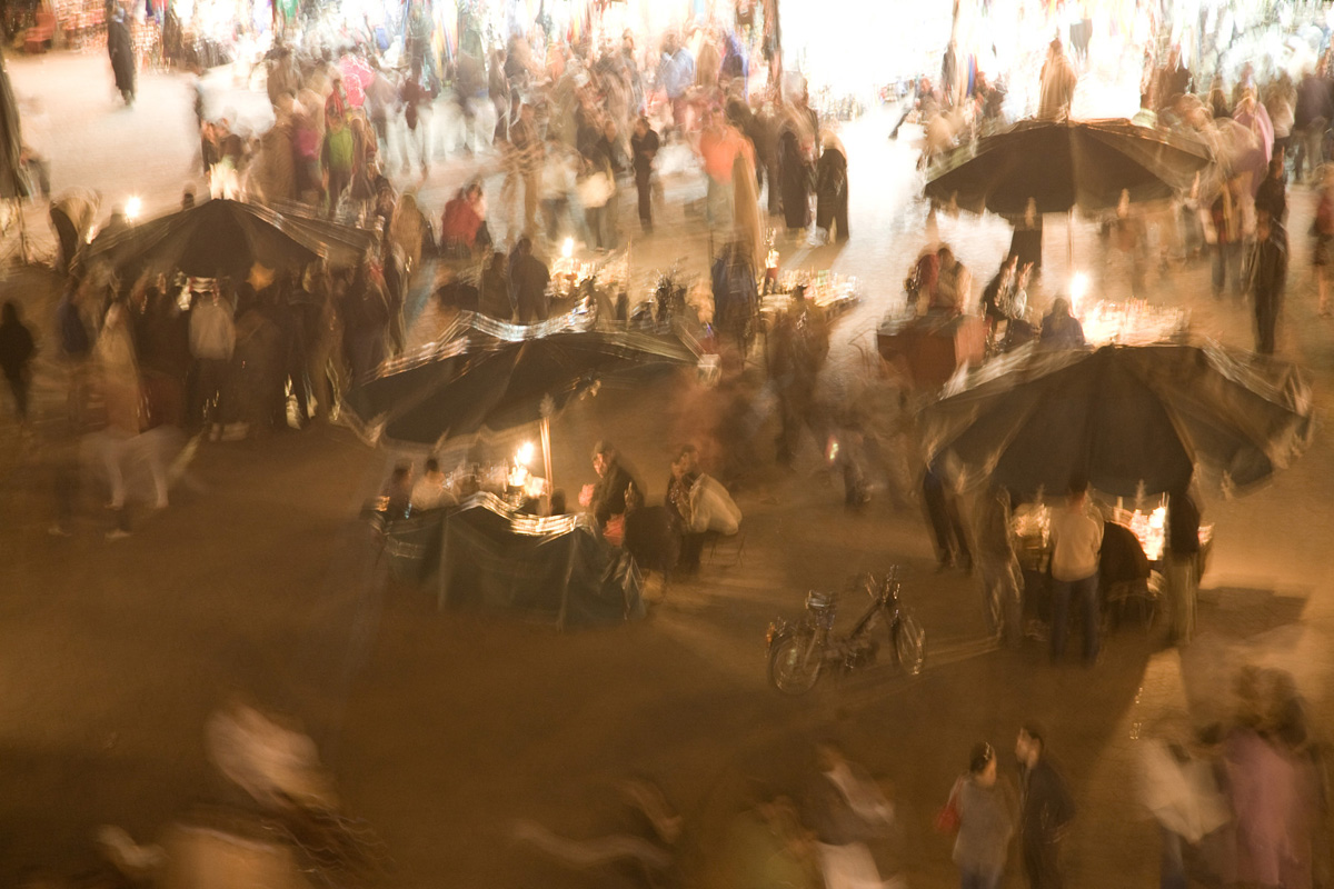 Jemaa el Fna è un palcoscenico che muta la sua scenografia e i suoi attori col trascorrere delle ore. Gli amanti dopo avere sorseggiato l'ennesimo the alla menta e predire il futuro dal vecchio cartomante si confondono tra la folla.